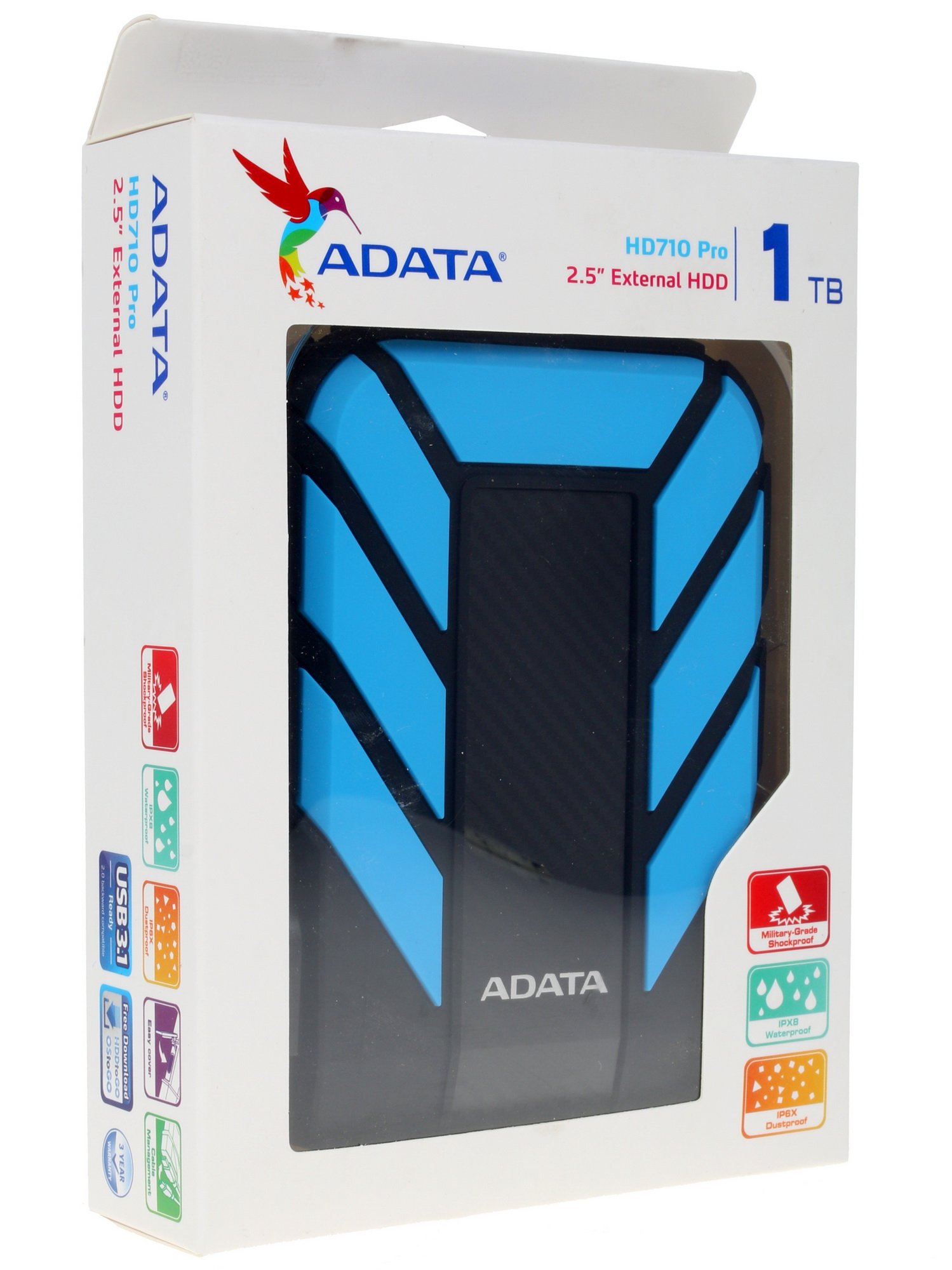 Устройство предлагает 1 ТБ памяти, что позволит хранить на нем коллекционные фотографии, семейные видео или музыку, которая вам нравится. A-Data HD710 Pro [AHD710P-1TU31-CBL] выполнен в синем корпусе и поддерживает подключение к любым цифровым, мобильным и компьютерным устройством, используя для этого интерфейсы USB 3.0 Type A, USB 2.0 Type A, а также USB 3.1 Type A. Технология Shock предусматривает высокую чувствительность к вибрациям, защищая вешний диск от ударов.