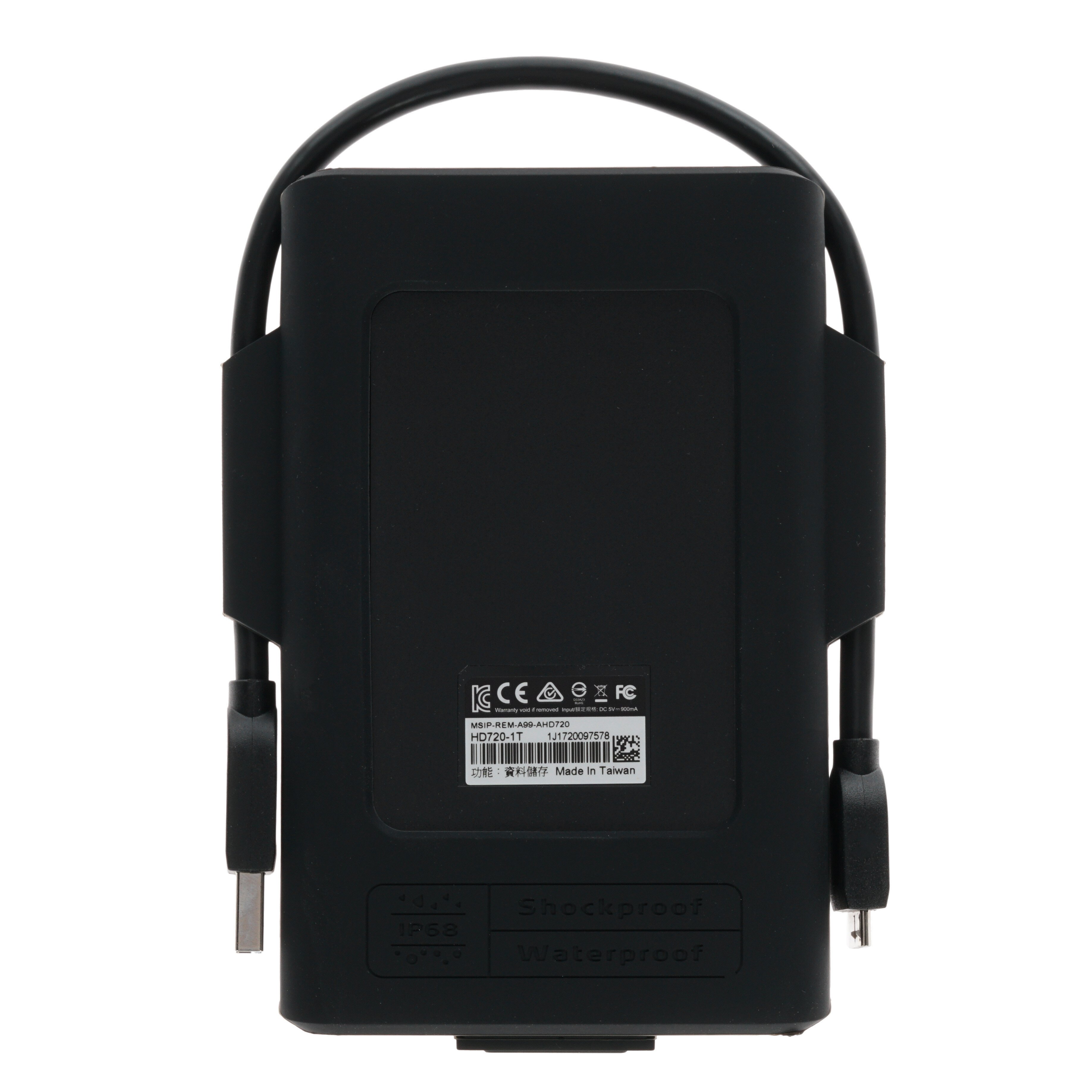 Внешний HDD ADATA HD720 [AHD720-1TU31-CBK] выполнен в корпусе из пластика и резины. Класс защиты IP68 обеспечивает водонепроницаемость и устойчивость к проникновению пыли. Благодаря соответствию стандартам MIL-STD-810G накопитель выдерживает падения с высоты до 1.8 м, удары, сотрясения, вибрацию.
