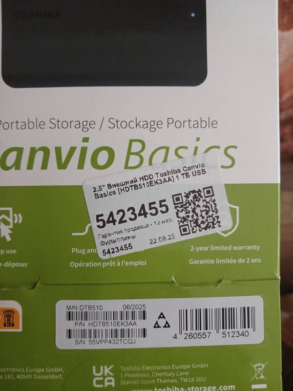 Внешний HDD 2.5" Toshiba Canvio Basics, 1TB, USB 3.2 Gen 1 Type-A, 5400 rpm, черный (аналог HDTb410EK3AA)