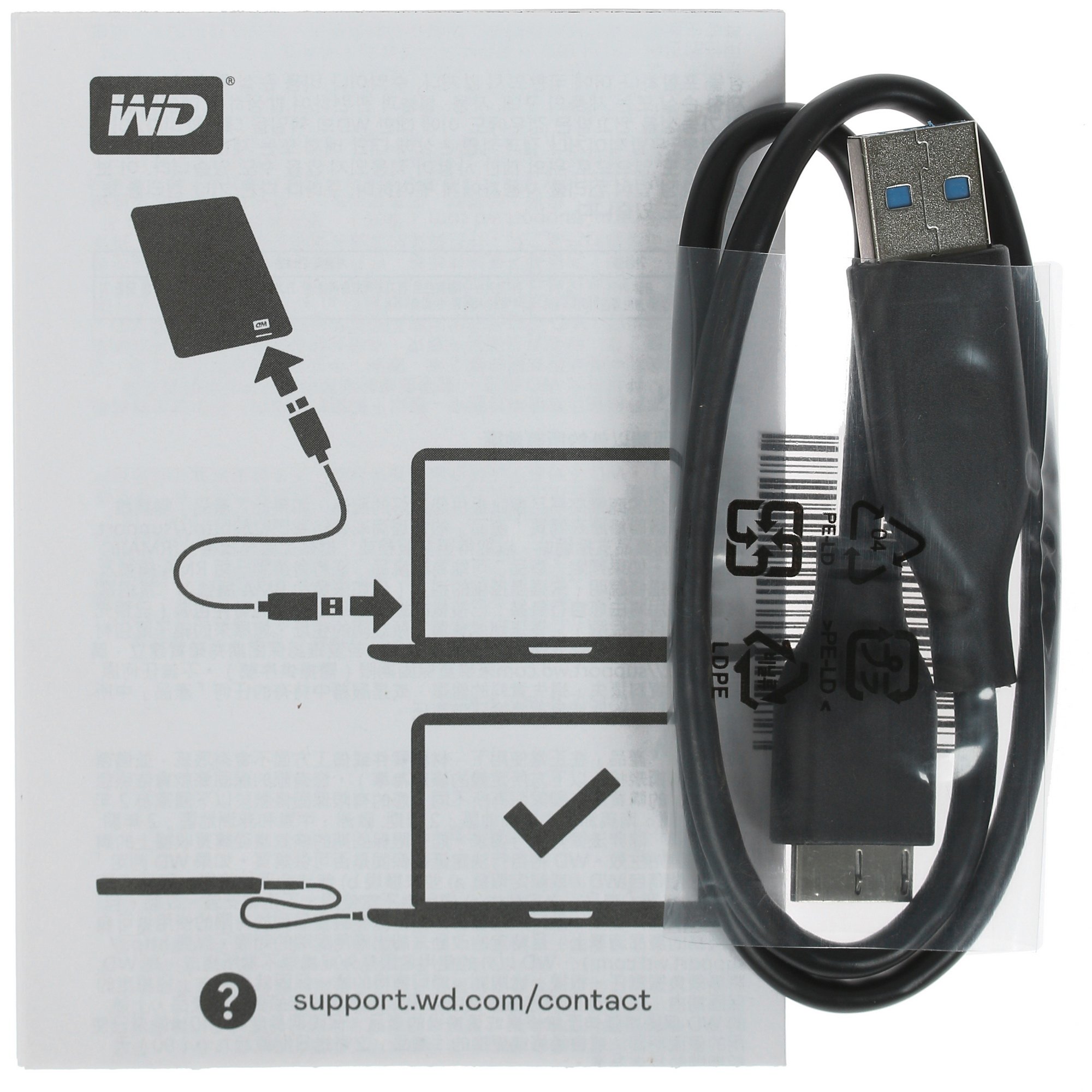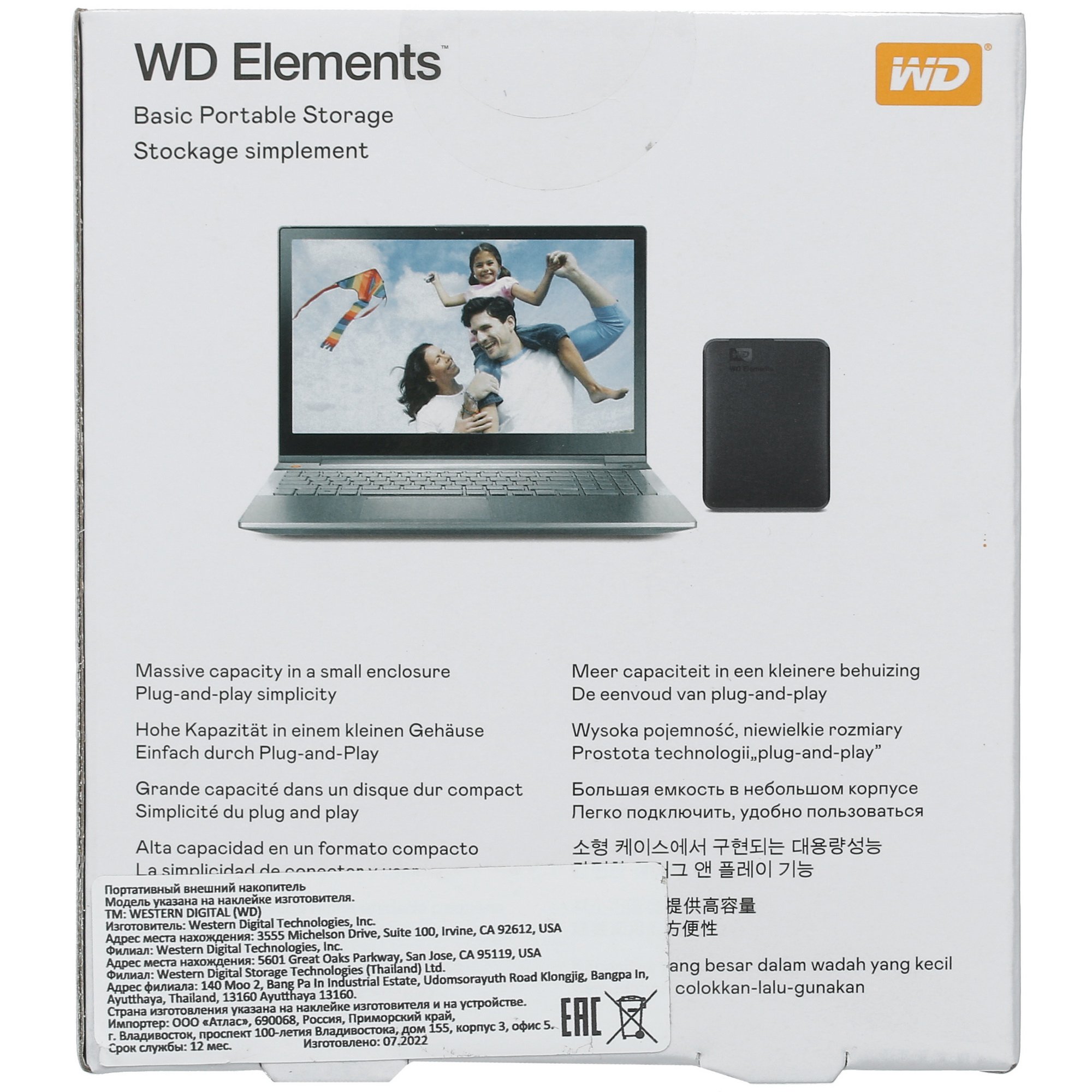 Внешний HDD WD Elements Portable представлен в классическом черном цвете корпуса. Для его изготовления использовался легкий пластик, благодаря которому вес накопителя не превышает 134 г. Представленное в форм-факторе 2.5" устройство совместимо с любыми операционными системами, включая Mac OS, не требуя для своей работы установки дополнительного софта. Кабель для подключения накопителя включен в комплект поставки.