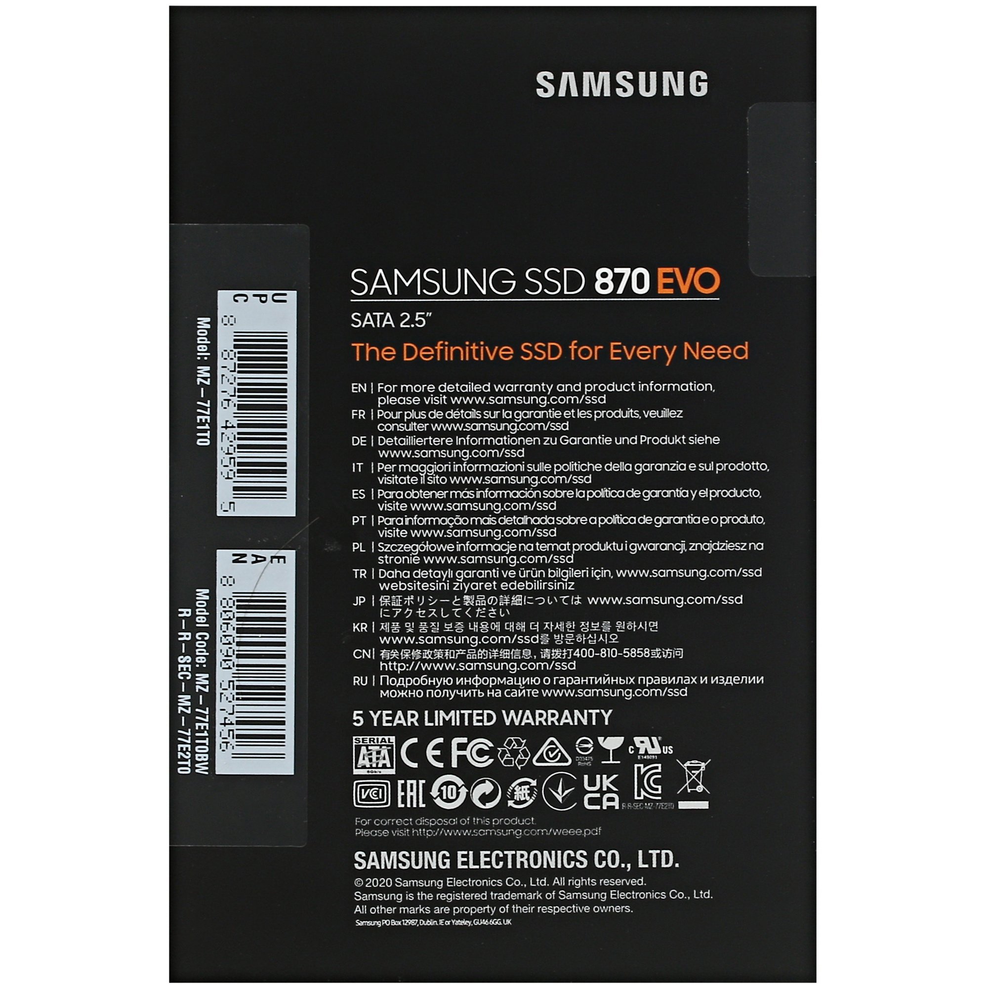 SATA накопитель Samsung 870 EVO обеспечивает надежность хранения данных и повышение отзывчивости системы ПК при выполнении различных задач. Интерфейс SATA и технология 3D NAND гарантируют скорость на уровне показателя 560 Мбайт/сек в режиме чтения и 530 Мбайт/сек в режиме записи. Объем 1000 ГБ предоставляет достаточно пространства для хранения документов, мультимедийных файлов и прочего контента. С помощью фирменного ПО Samsung Magician можно выполнять мониторинг системы и управлять различными настройками накопителя. Тонкий и прочный корпус Samsung 870 EVO устойчив к ударам и вибрации.