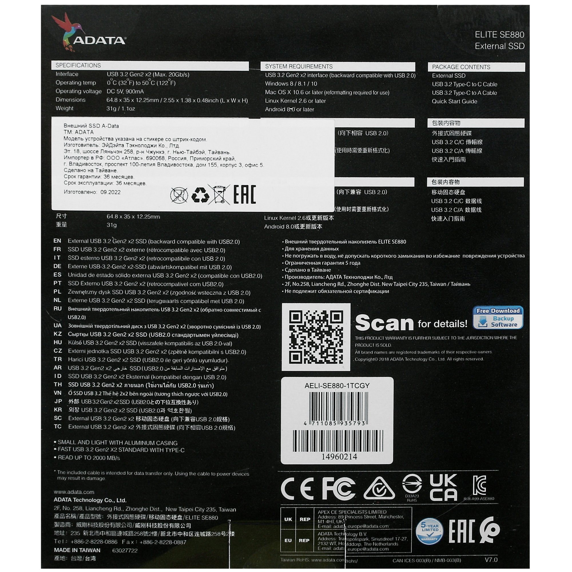 Внешний SSD A-Data AELI-SE880 объемом 1000 ГБ поможет сохранять большие коллекции игр, фотографий и видеороликов. Это карманный вариант для хранения воспоминаний: корпус устройства помещается в ладони, что позволяет всегда носить его с собой. Диск совместим с любыми компьютерными устройствами вне зависимости от используемой ОС. Для подключения используется интерфейс USB 3.2 Gen2x2 Type-C в предельно высокой скоростью передачи данных.