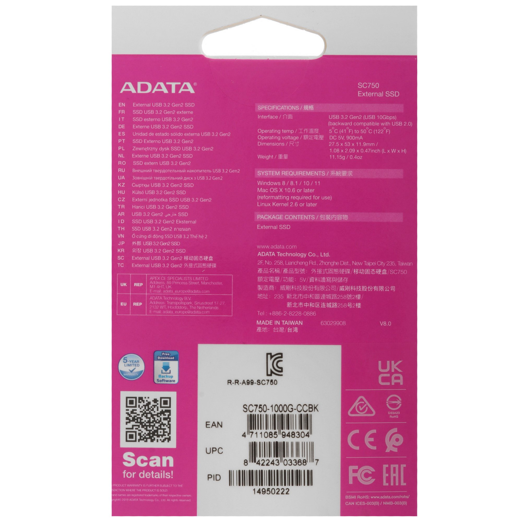 Внешний SSD ADATA SC750, 1TB, USB 3.2 Gen 2 Type-C, R/W 1050/1000, черный