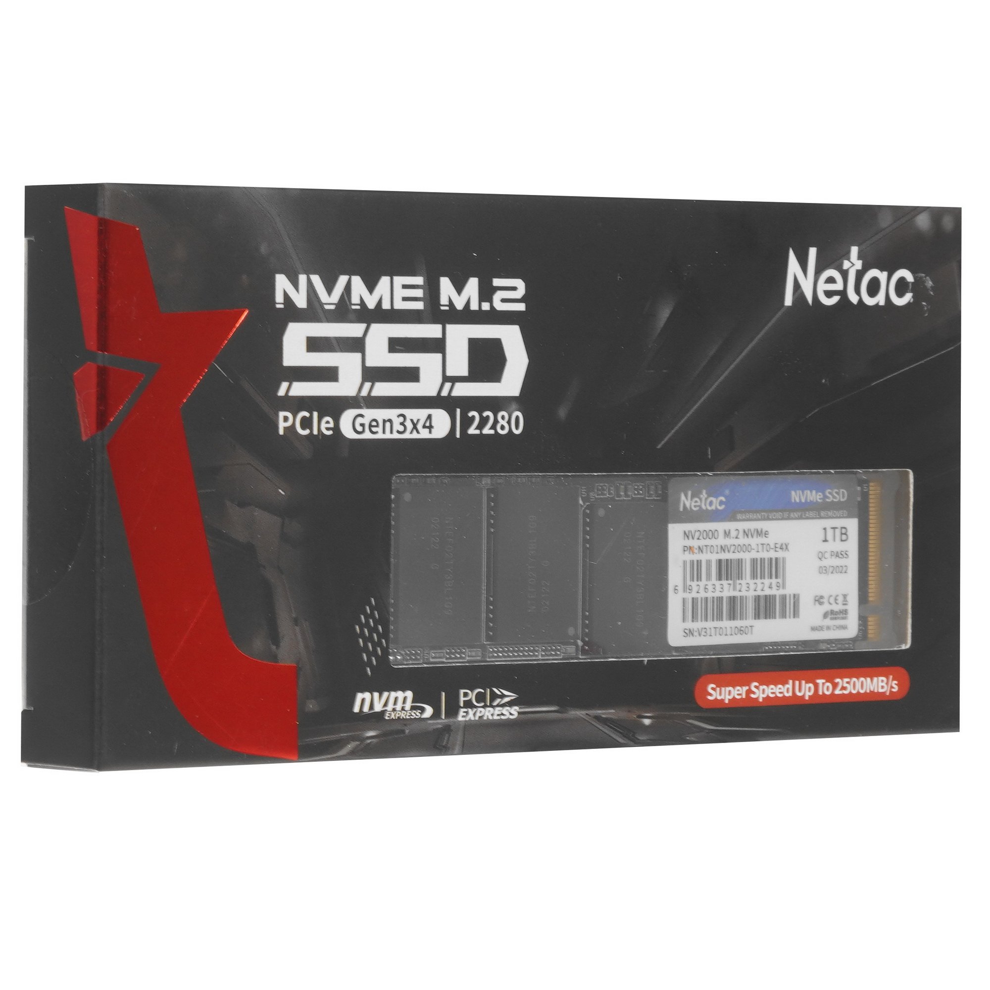 Накопитель SSD Netac NV2000, 1Tb, PCIe 3.0 x4, M.2 2280, NVMe, R/W 2500/2100