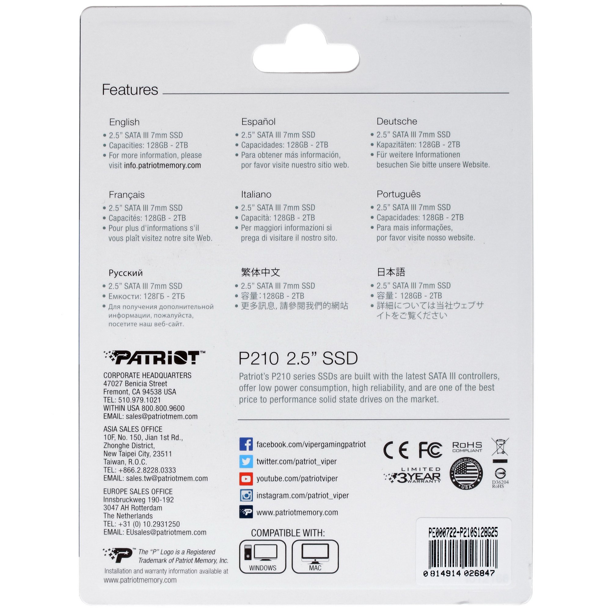SSD-накопитель Patriot Memory P210 [P210S128G25] выполнен в прочном корпусе, обеспечивающим надежную защиту от повреждений. Благодаря формату 2.5” модель может легко устанавливаться как в системные блоки, так и в моноблоки, и в ноутбуки. При помощи отдельно приобретаемого бокса диск может использоваться и как внешнее устройство для работы с файлами.