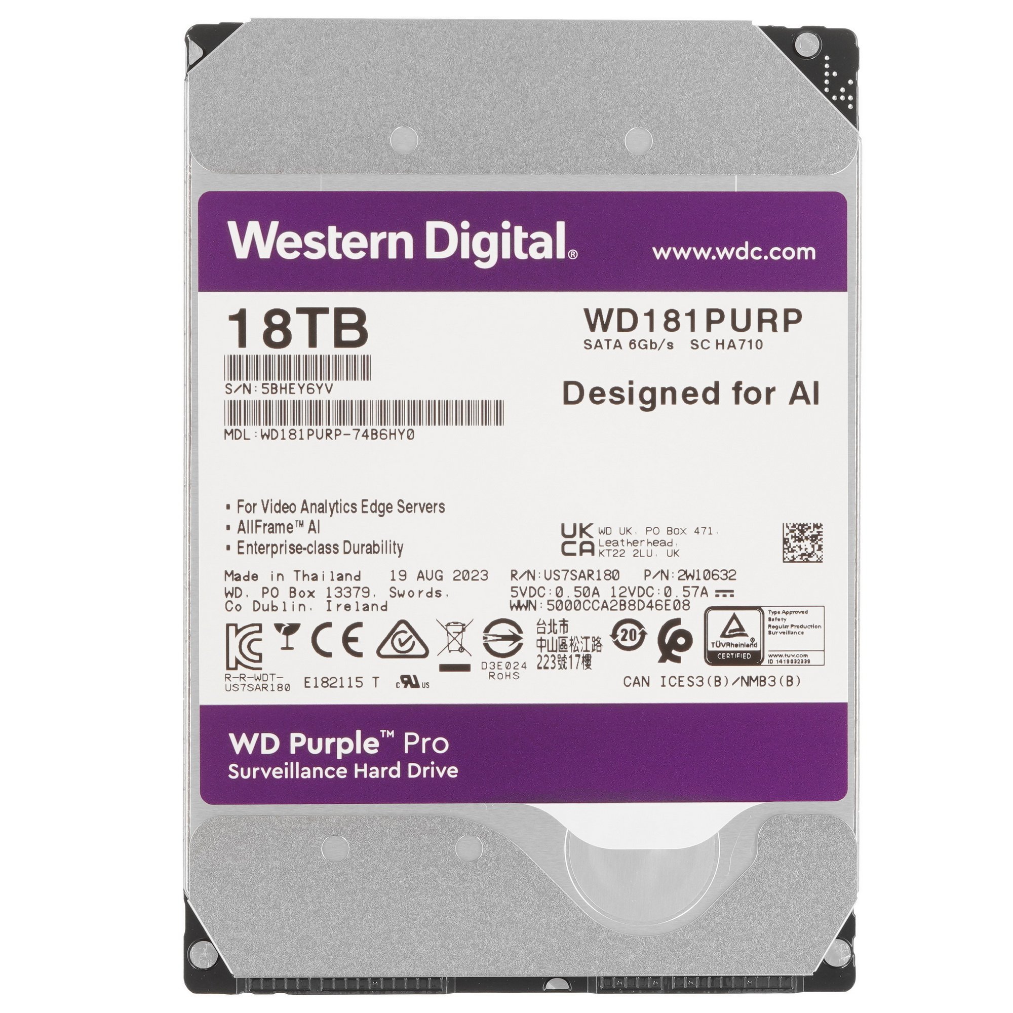 Жесткий диск WD Purple Pro на 18 ТБ с 512 МБ кэш-памяти – оптимальный вариант для видеосистем и серверов. При установке накопителя для обычного ПК стоит учитывать его повышенное энергопотребление: 6.3 Вт при работе, 5.9 Вт в режиме ожидания. Устройство с подключением по интерфейсу SATA III поддерживает пропускную способность 6 Гбит/с.