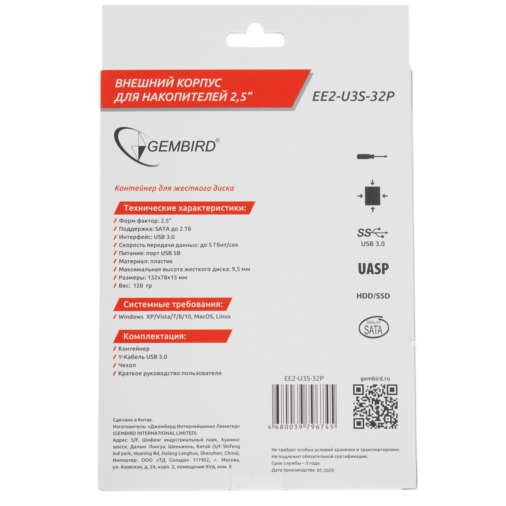 Внешний бокс Gembird EE2-U3S-32P при установке накопителя HDD и SSD форм-фактора 2.5 дюйма превращает запоминающее устройство в портативное. Он выполнен из прочного прозрачного пластика, поэтому уберегает накопитель от пыли и различных неблагоприятных воздействий в процессе транспортировки или хранения. Gembird EE2-U3S-32P отличается компактными размерами и простотой в установке. Подключение и питание осуществляется посредством интерфейсного разъема USB. В комплекте с боксом поставляются кабель подключения USB и практичный чехол.