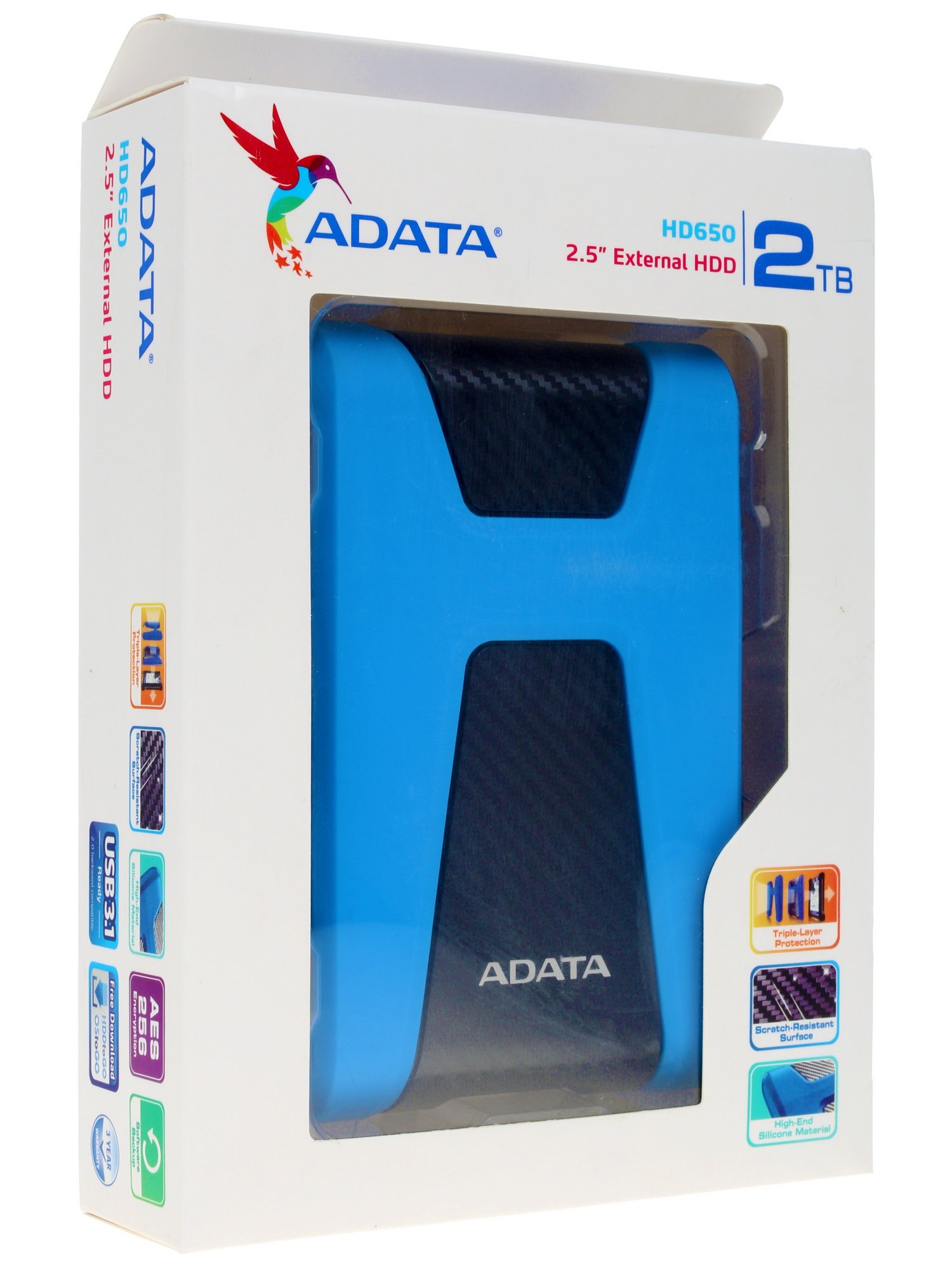 Внешний HDD A-Data HD650 [AHD650-2TU31-CBL] – аксессуар, корпус которого произведен с использованием резины и прочного пластика. Эти материалы характеризуются повышенной износоустойчивостью, что позволяет им в полной мере противостоять внешним негативным воздействиям.