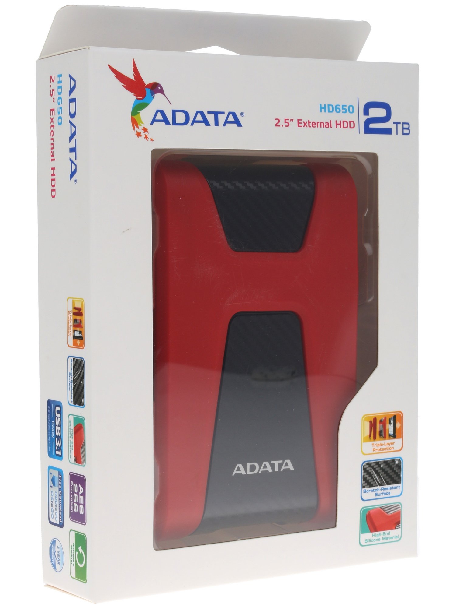 2-терабайтный внешний HDD A-Data HD650 [AHD650-2TU31-CRD] можно использовать в качестве как средства обмена информацией, так и в роли устройства для резервного копирования. Важным конструктивным преимуществом HDD является трехслойная конструкция его корпуса, обеспечивающая эффективную защиту от ударных нагрузок. Корпус накопителя имеет привлекательный внешний вид, а его резиновое покрытие гарантирует качественный хват. HDD характеризуется частотой вращения шпинделя, равной 5400 оборотам в минуту.