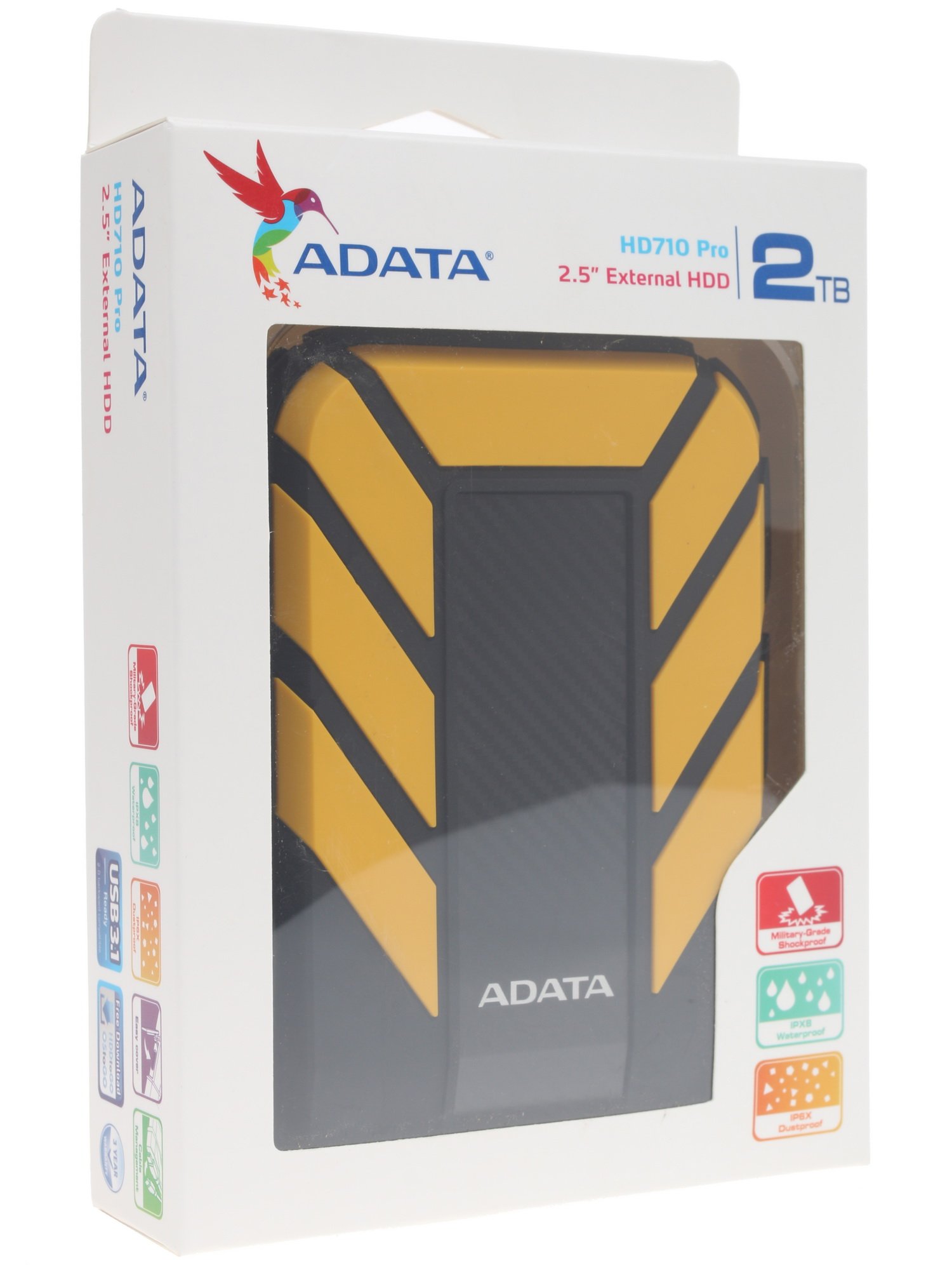 Внешний HDD A-Data HD710 Pro [AHD710P-2TU31-CYL] соответствует 2.5-дюймовому форм-фактору. Корпус накопителя имеет пылевлагозащищенные свойства, которые реализуются при плотно закрытой крышке USB-порта. При оформлении дизайна устройства был использован стильный желтый цвет. Модель имеет габаритные размеры, составляющие 133.3x98.5x26.7 мм. Невысокая (она равна 390 г) масса накопителя способствует удобству его транспортировки и эксплуатации.