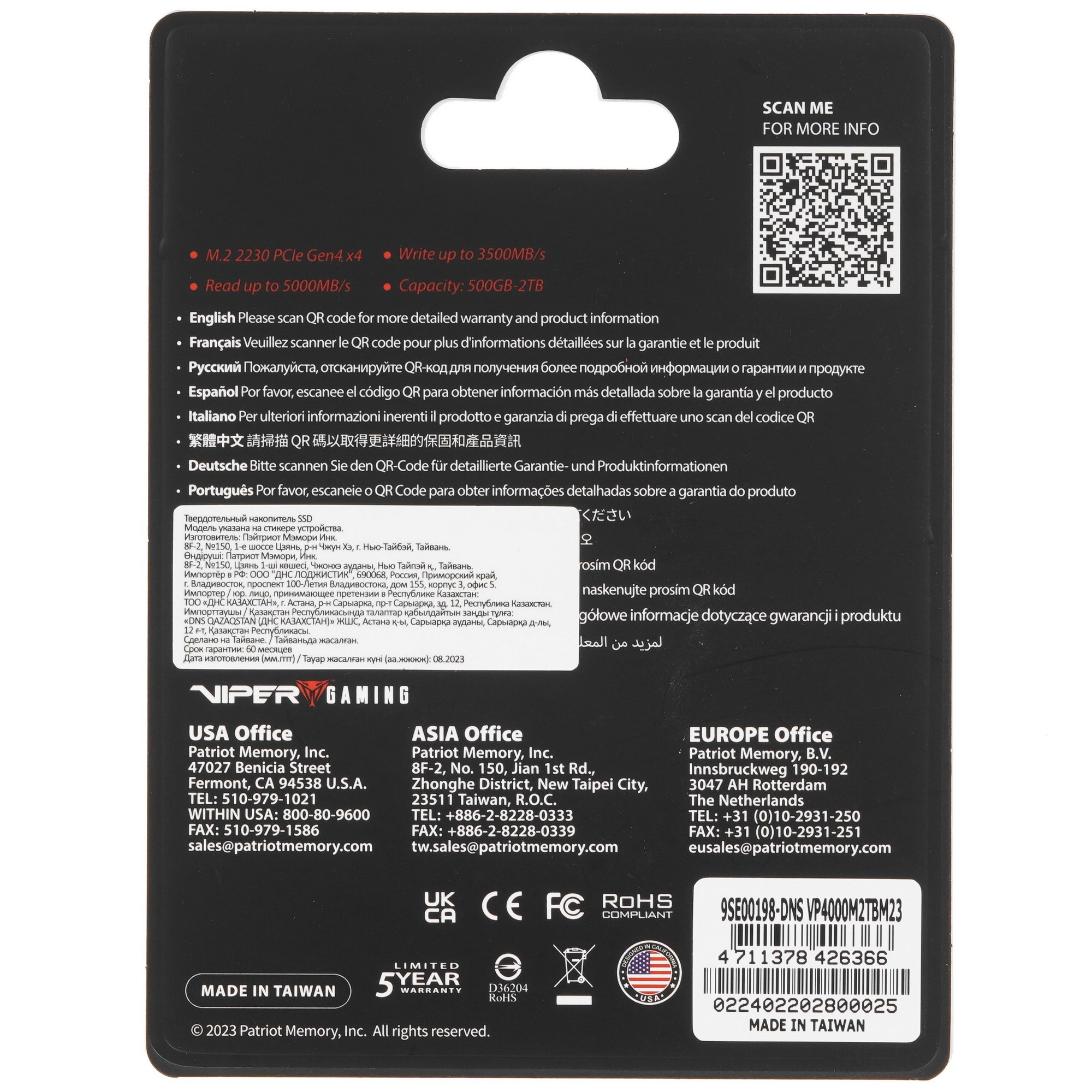 SSD M.2 накопитель Patriot Viper VP4000 Mini [VP4000M2TBM23] обеспечивает скорость последовательного чтения до 5000 МБ/с. Соответствующий показатель для записи – 3500 МБ/с. Модель гарантирует высокую производительность при выполнении файловых операций в играх и любом программном обеспечении. Накопитель поддерживается операционными системами Microsoft Windows 7, 8, 8.1, 10 и 11. Максимальный ресурс записи устройства равен 450 ТБ.