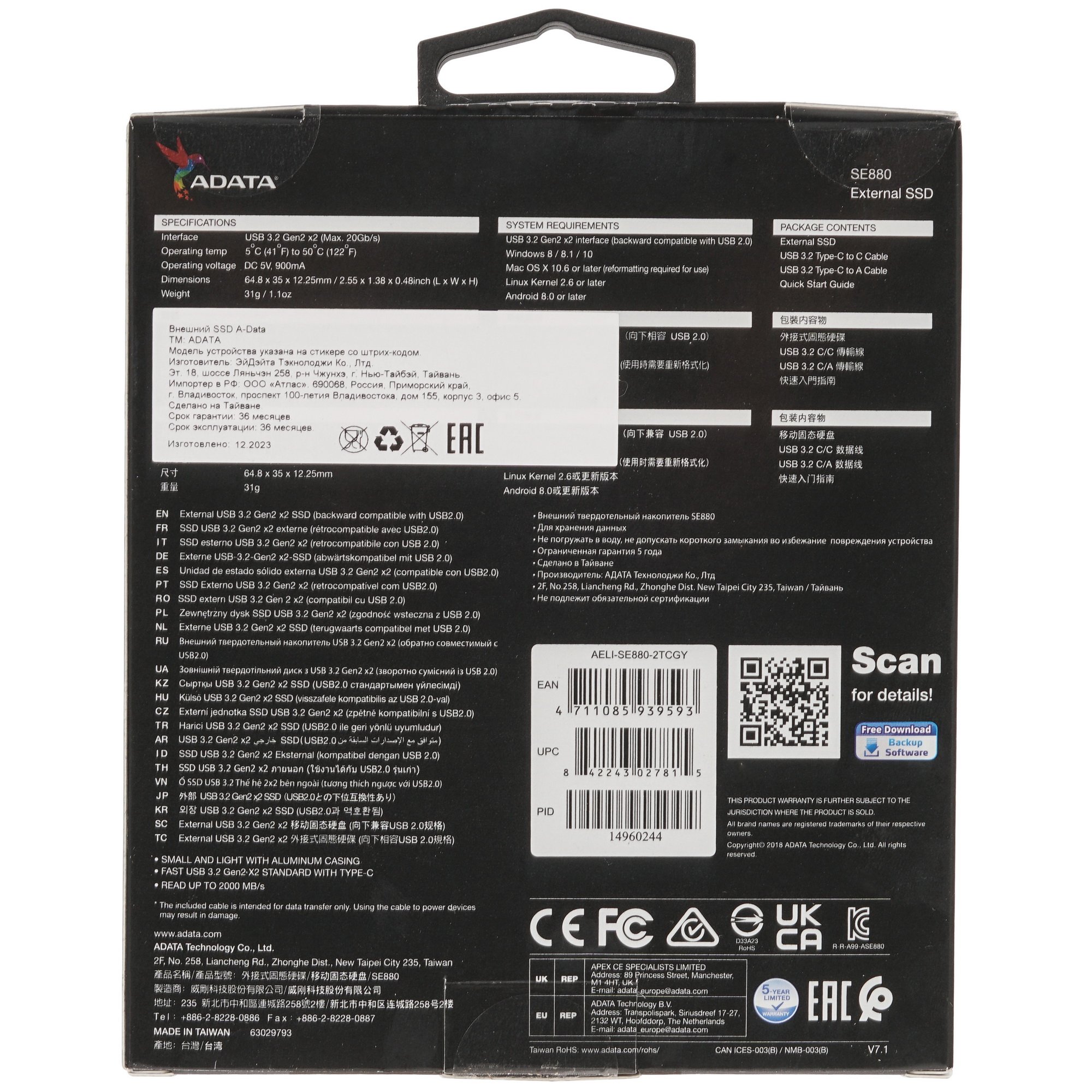 ADATA Elite SE880 объемом 2 ТБ подходит для хранения сборника программ для работы и развлечений, фото- и видеоархива, других объемных файлов. Накопитель совместим с операционными системами Android, Linux, Mac и Windows. Твердотельный диск идет в комплекте с 2 кабелями для подключения к разным версиям USB-портов.