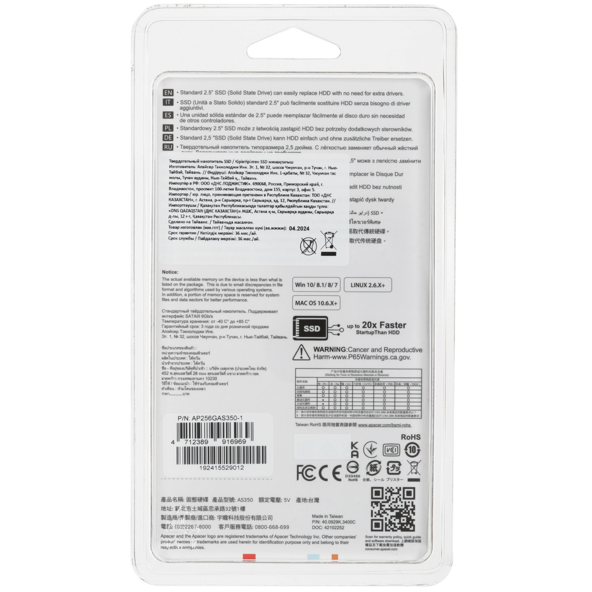 Твердотельный накопитель SSD 2.5" SATA-3 256Gb Apacer AS350 форм-фактора 2.5 дюйма подходит для использования в составе настольного компьютера, ноутбука, сервера. Он построен на основе DRAM-less контроллера SM2259XT и микросхем 3D TLC производства Hynix, выполненных по 128-слойной технологии. Встроенная память устройства составляет 256 ГБ. Скорость чтения для SSD 2.5" SATA-3 256Gb Apacer AS350 достигает 560 МБ/с, а записи – 540 МБ/с. Корпус накопителя украшен оригинальным рисунком.