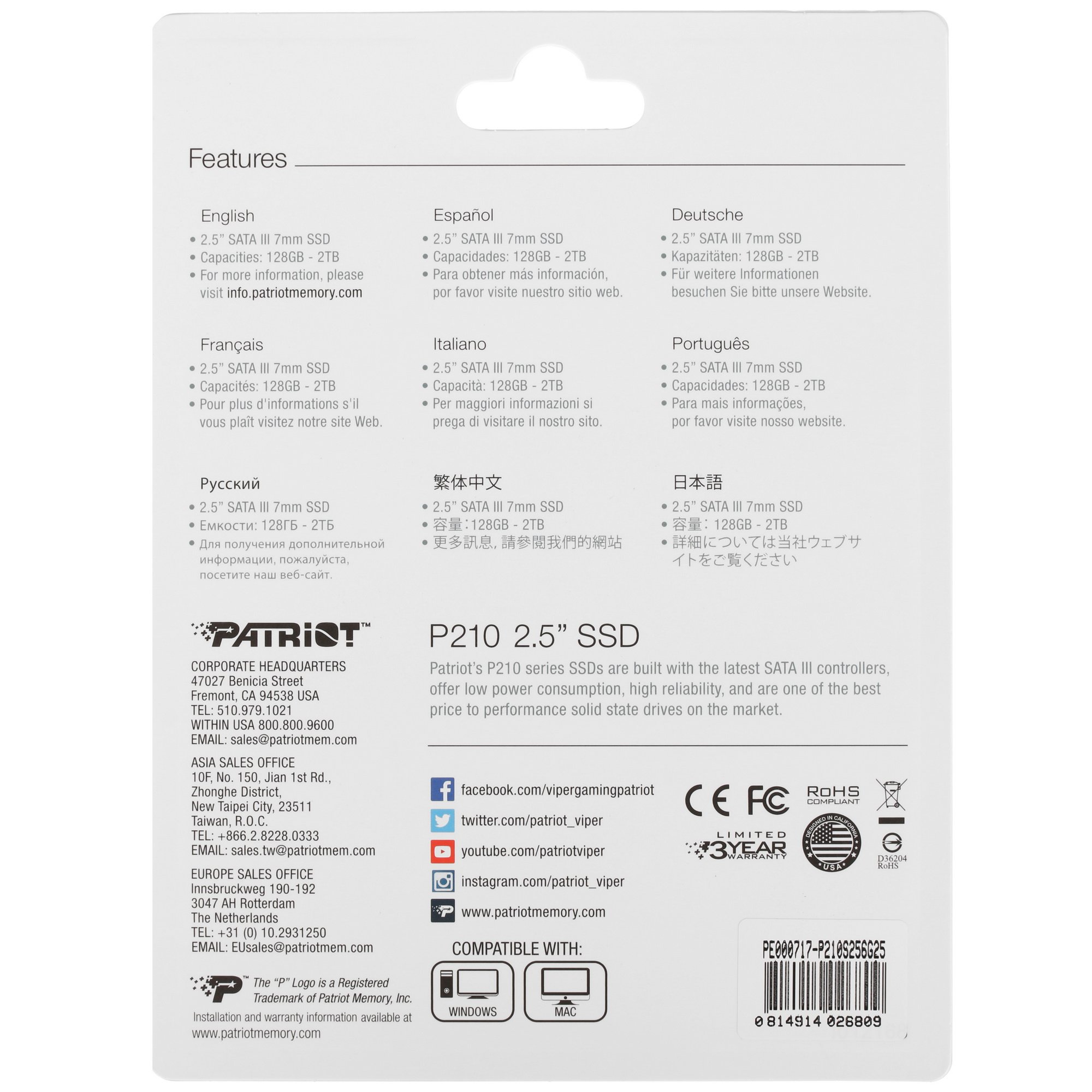 Поддержка технологии SMART позволяет выполнять диагностику основных параметров работы накопителя Patriot Memory P210. Отсутствие движущихся компонентов гарантирует бесшумную работу. Помимо этого, накопитель отличается тонким корпусом, экономичным потреблением энергии и длительной эксплуатацией. Время наработки на отказ составляет 2 млн часов.