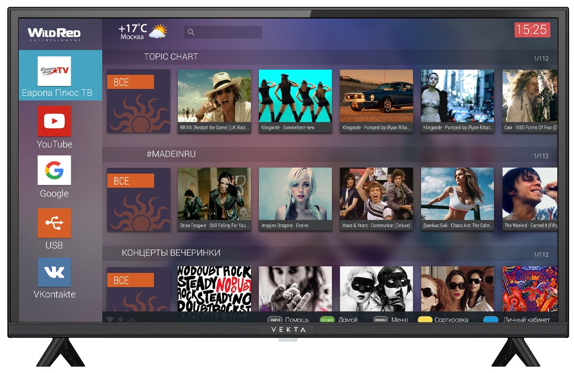 Телевизор Vekta LD-32SF4850BS с диагональю экрана 81 см отображает FullHD-контент в разрешении 1920x1080 пикселей. Расположенные за матрицей светодиоды обеспечивают высокую яркость изображений. Встроенный Smart TV служит для просмотра контента с различных сайтов Интернета. Оперативная память объемом 1 ГБ и 4-ядерный процессор гарантируют быстрый запуск приложений. Динамики мощностью 16 Вт поддерживают технологию объемного звучания.