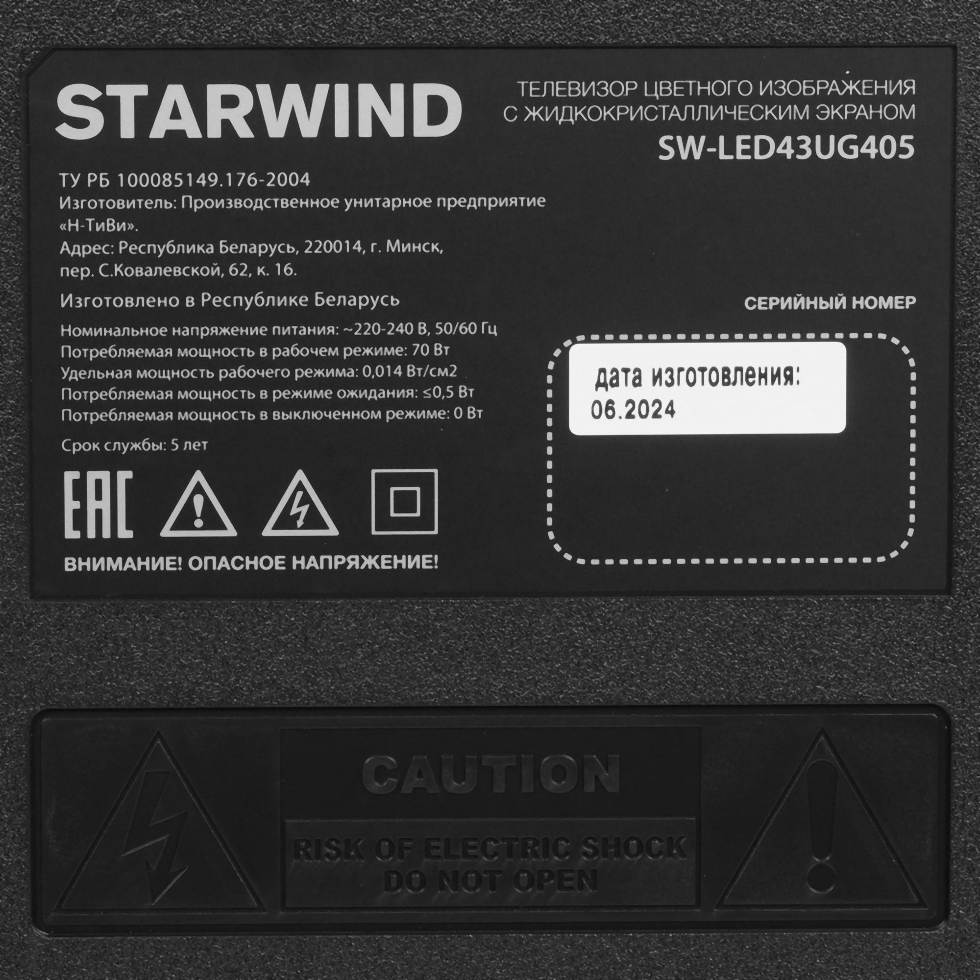 Дисплей прибора выполнен по безрамочной технологии и поддерживает воспроизведение в формате 4K Ultra HD c частотой обновления 60 Гц. Максимальное разрешение картинки Starwind SW-LED43UG405 достигает 3840х2160 пикселей с широкими углами обзора по диагонали и вертикали – до 178 градусов. Диагональ экрана – 43 дюйма.