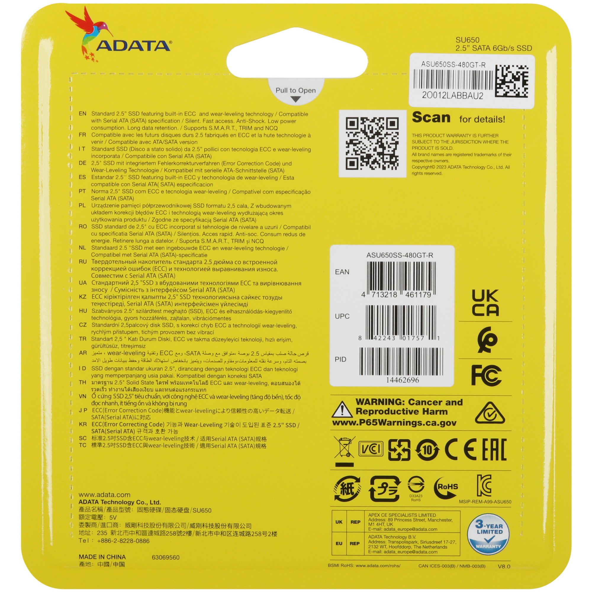 SSD-накопитель ADATA SU650 [ASU650SS-480GT-R] имеет объем 480 Гб и основан на чипах памяти NAND со структурой 3D NAND благодаря чему обеспечивается стабильность и высокая отказоустойчивость. Максимальный ресурс записи составляет 280 Тб. Подключение накопителя осуществляется посредством интерфейса SАTA III. Толщина корпуса составляет 7 мм.