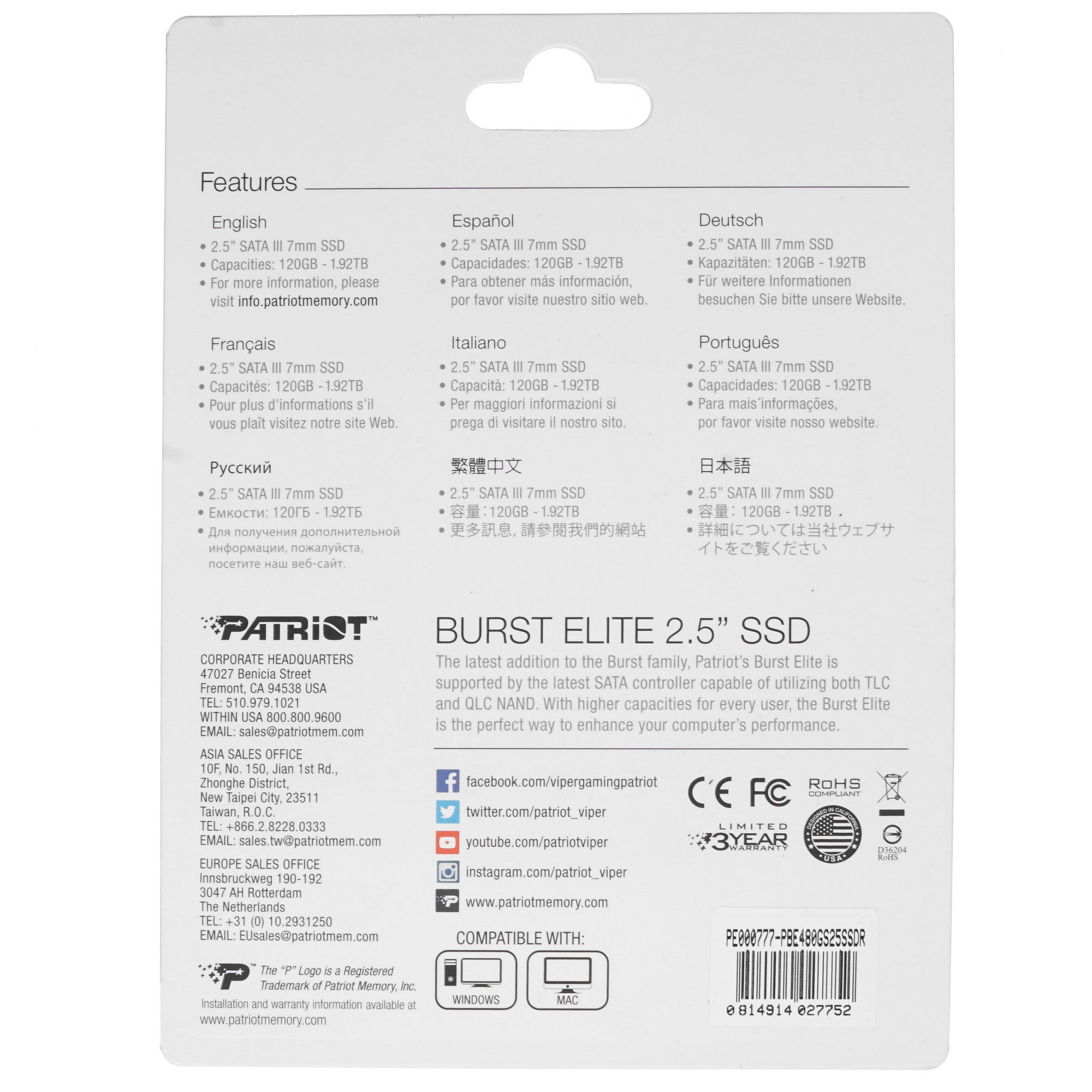 SSD-накопитель Patriot Burst Elite [PBE480GS25SSDR] — не только производительное, но и компактное решение. Модель выполнена в корпусе формата 2.5”, благодаря чему отлично подойдет для разных системных блоков и моноблоков, а также ноутбуков. При помощи внешнего бокса, который докупается отдельно, накопитель также может использоваться в качестве внешнего устройства для работы с файлами.