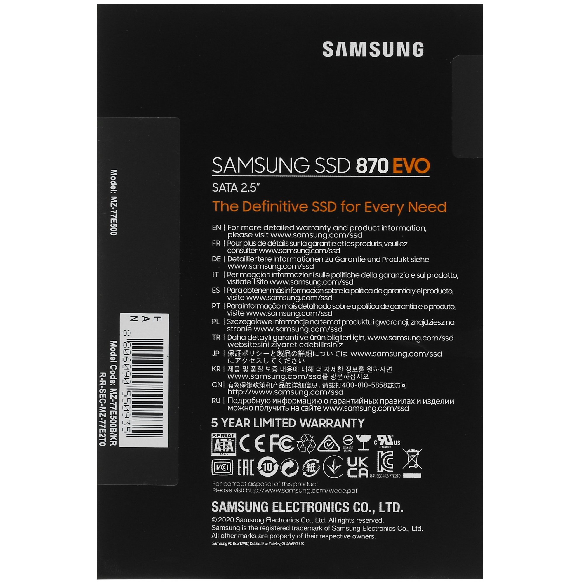 SATA накопитель Samsung 870 EVO [MZ-77E500B/KR] – это компактный и производительный диск на основе твердотельного устройства. Он подходит для интеграции в разные потребительские системы и обеспечивает благодаря скорости 560 Мбайт/сек в режиме чтения высокую продуктивность работы ПК. Для повышения отзывчивости накопителя при обработке данных реализован DRAM буфер.