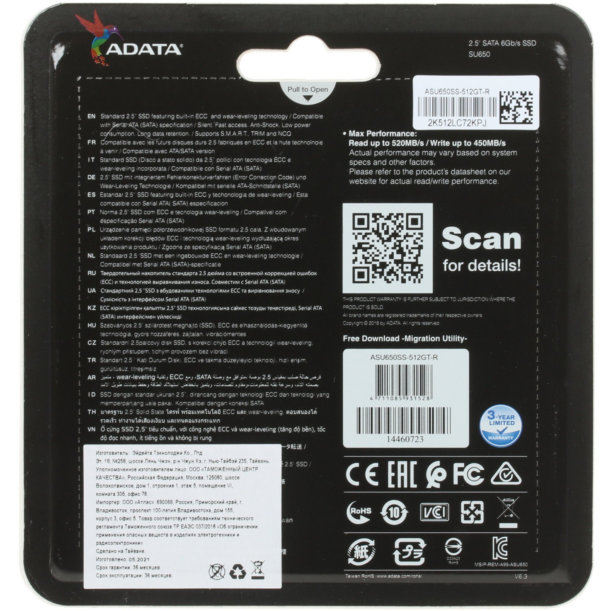 Накопитель SSD ADATA SU650, 512Gb, SATA III, 2.5", R/W 520/450