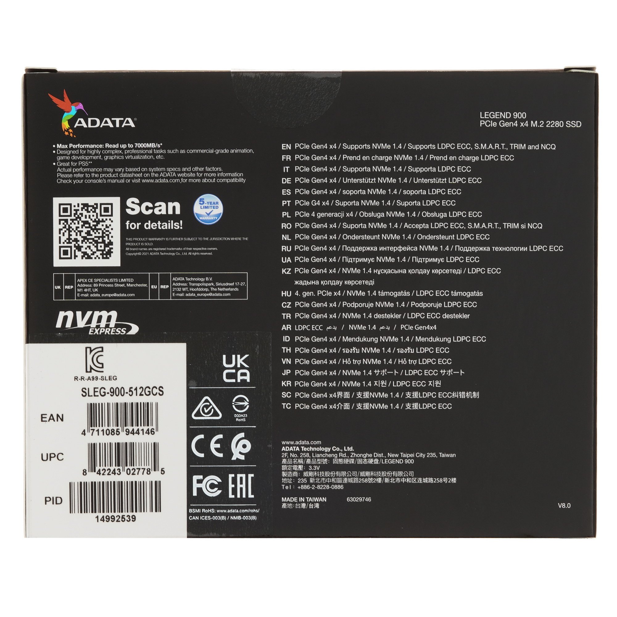 M.2 накопитель ADATA LEGEND 900 [SLEG-900-512GCS] с интерфейсом передачи данных PCIe Gen4 x4 обеспечивает высокую производительность для работы с ресурсоемкими программами и графическим контентом, а также запуска игр. Устройство совместимо с платформами Intel и AMD. Скорость в режиме последовательного чтения 6200 Мбайт/сек гарантирует быстродействие системы при обработке задач.