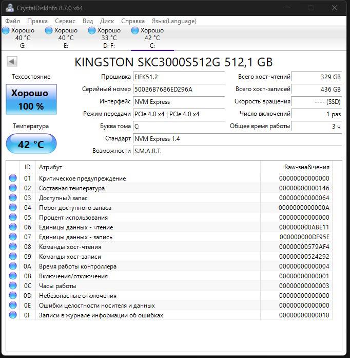 Накопитель SSD Kingston 512Gb M.2 KC3000 <SKC3000S/512G> (PCI-E 4.0 x4, up to 7000/3900Mbs, 3D TLC, NVMe, 400TbW, Phison E18, 22х80мм, LP heatsink)