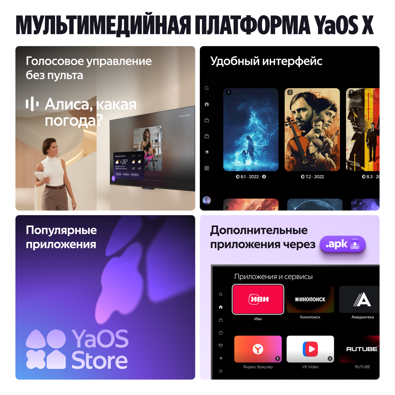 55" (139 см) Телевизор Яндекс ТВ Станция Про YNDX-00101К в корпусе черного цвета работает на платформе YaOS X и предлагает интеллектуальный голосовой помощник Алиса. С помощью ассистента с нейросетью YandexGPT вы можете голосовыми командами без пульта управлять всеми функциями ТВ, запускать приложения и искать информацию в Интернете. Модель получает экран с поддержкой разрешения 3840x2160 и функцией повышения плавности изображения в динамичных сценах MEMC.