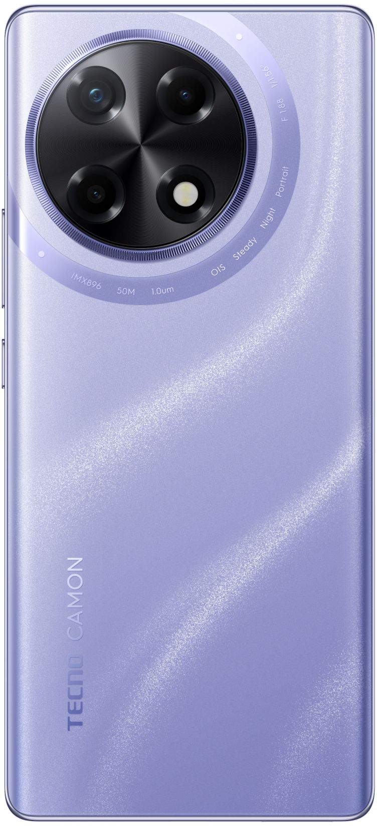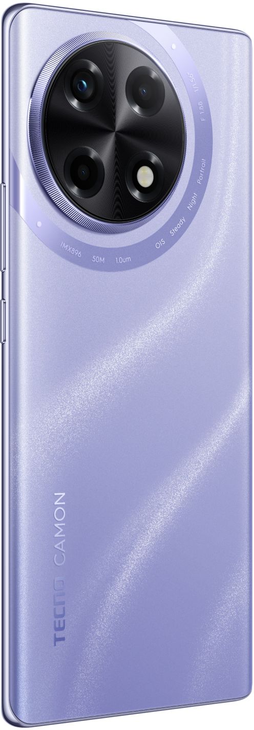 Визуально модель выглядит тоньше других смартфонов серии CAMON 30, но дизайн все также отсылает к деталям профессионального фотоаппарата. Круглый блок камер напоминает объектив с рифленой кромкой и упоминанием характеристик. Все версии имеют заднюю пластиковую панель с рисунком, напоминающий еле уловимый Млечный путь на ночном небе. Холодный светло-фиолетовый оттенок корпуса при попадании УФ-