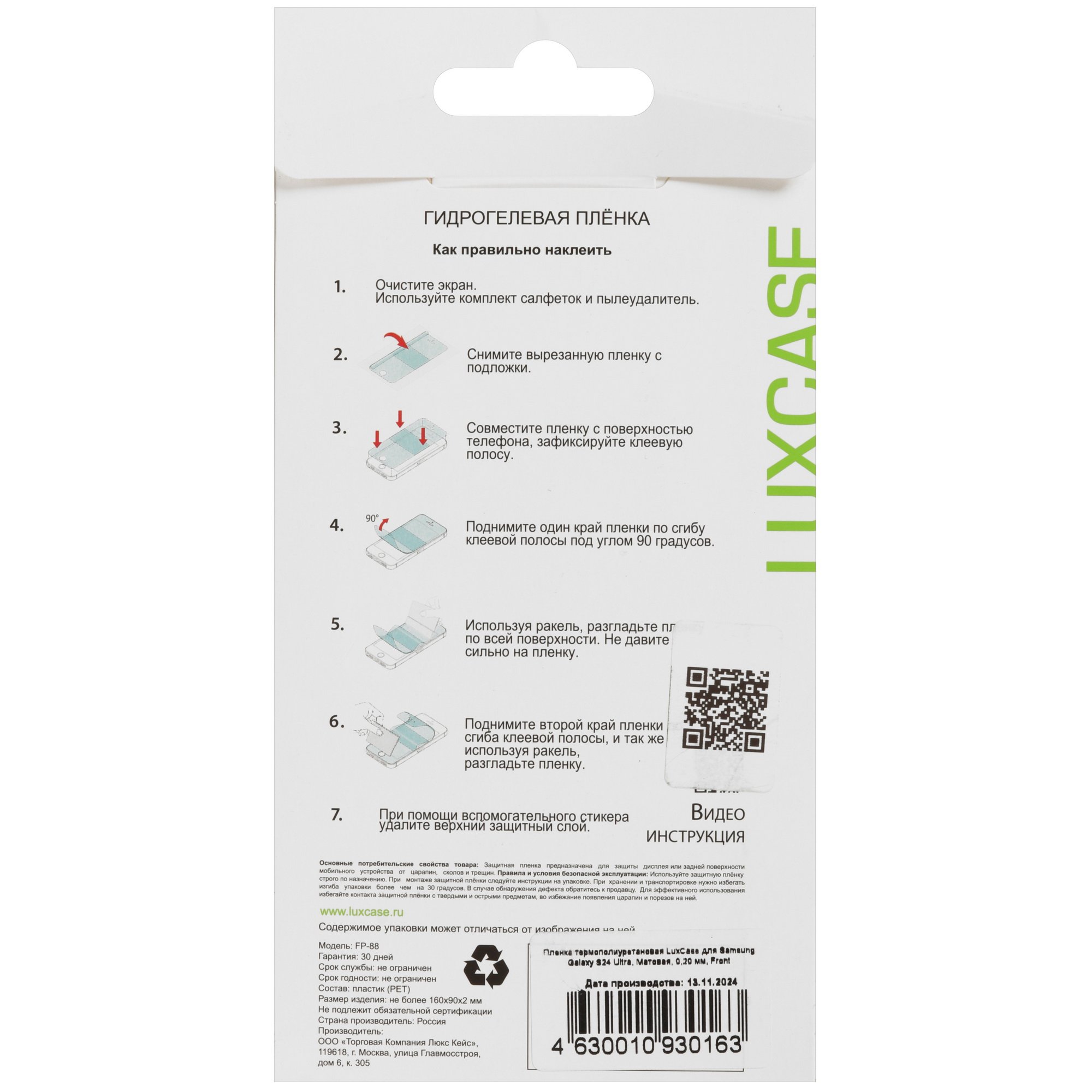 Пленка защитная LuxCase для Samsung Galaxy S24 Ultra предназначена для экрана с диагональю до 6.8". Аксессуар с матовым покрытием не дает бликам от солнца и искусственного освещения мешать полноценной работе с мобильным устройством. Пленка защищает дисплей от пыли и брызг, появления потертостей, царапин и прочих повреждений.