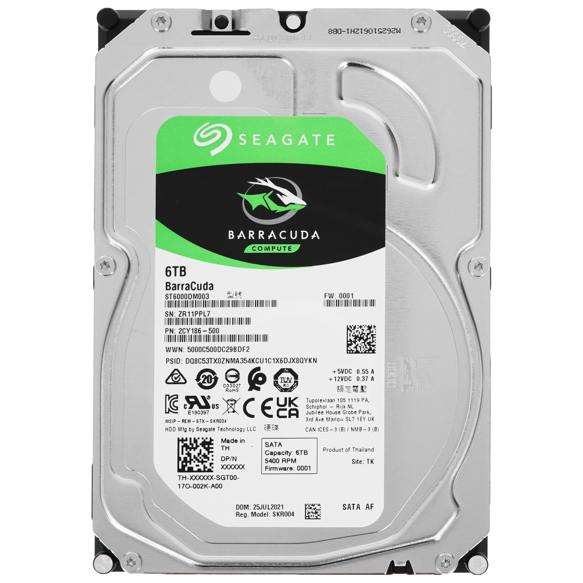 Жесткий диск Seagate BarraCuda [ST6000DM003] – производительное и надежное решение для использования в составе настольного компьютера. Емкость данного накопителя составляет 6 ТБ, что обеспечивает хранение большого объема различных документов и мультимедийных файлов. Интерфейс SATA с высокой пропускной способностью обеспечивает отзывчивость и широкую совместимость с ПК. Металлическая панель на верхней стороне защищает накопитель от механических воздействий. Среди прочих особенностей Seagate BarraCuda отмечаются технология повышения плотности записи SMR и низкий расход электроэнергии.
