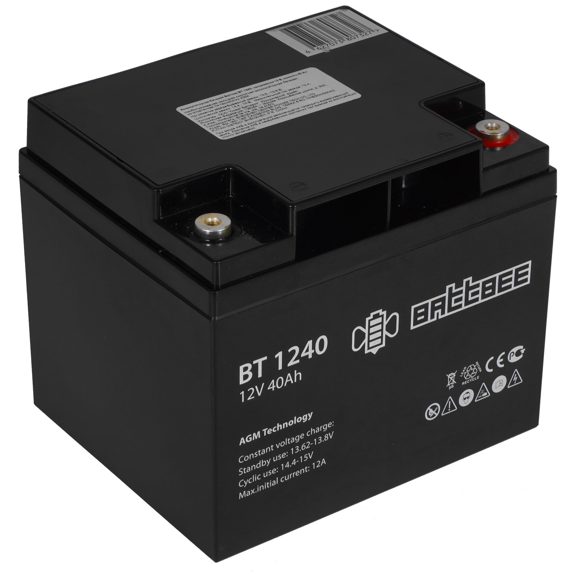 Аккумулятор BattBee BT 1240 подключается к системе с помощью клеммы В4 под болт с гайкой. Прочный пластиковый корпус надежно защищает содержимое от внешнего воздействия. Батарею можно устанавливать в любом положении и использовать при температуре до +50 °C. Благодаря небольшому размеру, изделие занимает минимум места.