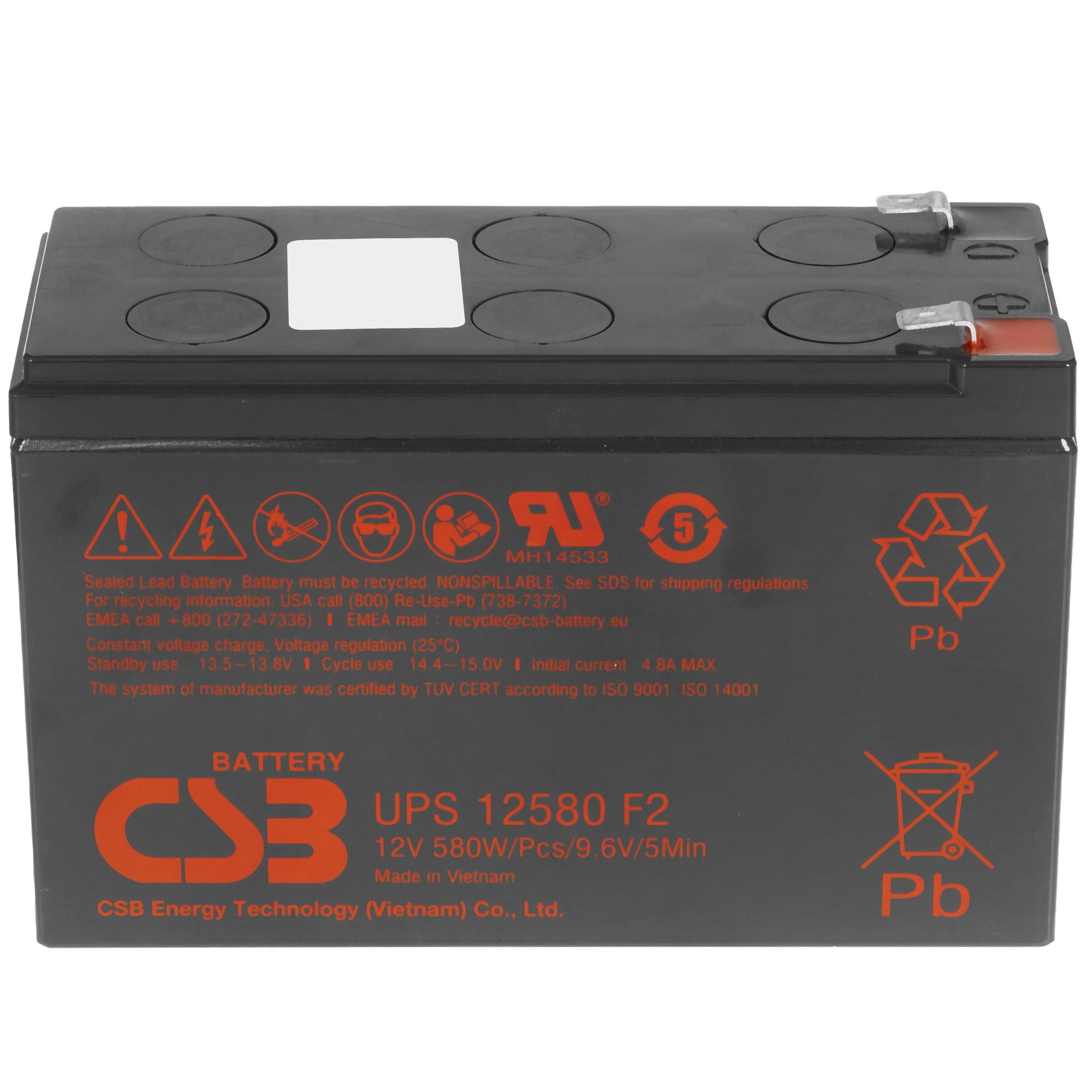 Подключение к оборудованию выполняется с помощью клемм стандарта T2/F2. Ударопрочный корпус из пластика ABS устойчив к механическим повреждениям и перепадам температуры. Батарея CSB UPS12580 F2 рассчитана на срок службы до 5 лет в буферном режиме.