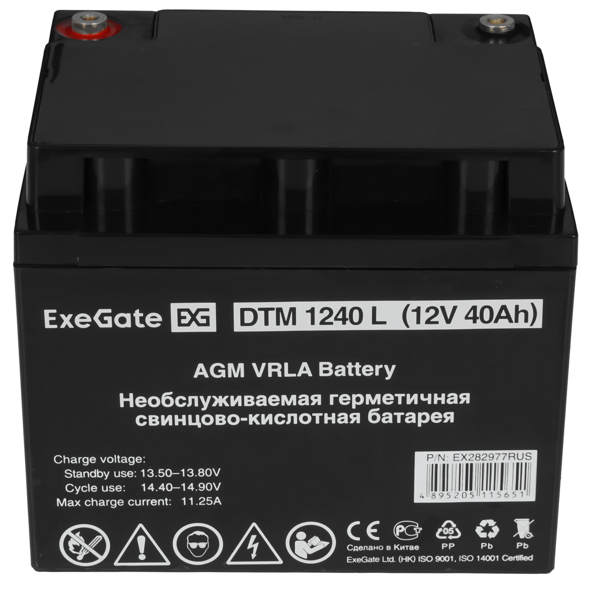 ExeGate DTM 1240 L с напряжением 12 В и емкостью 40 А∙ч оснащена клеммами типа Т12 под болт М5. Совместимая с разными моделями ИБП свинцово-кислотная батарея – резервный источник питания для разных типов приборов. АКБ выдерживает до 6 лет интенсивной работы. Аккумулятор подходит для установки в ИБП в любом положении.