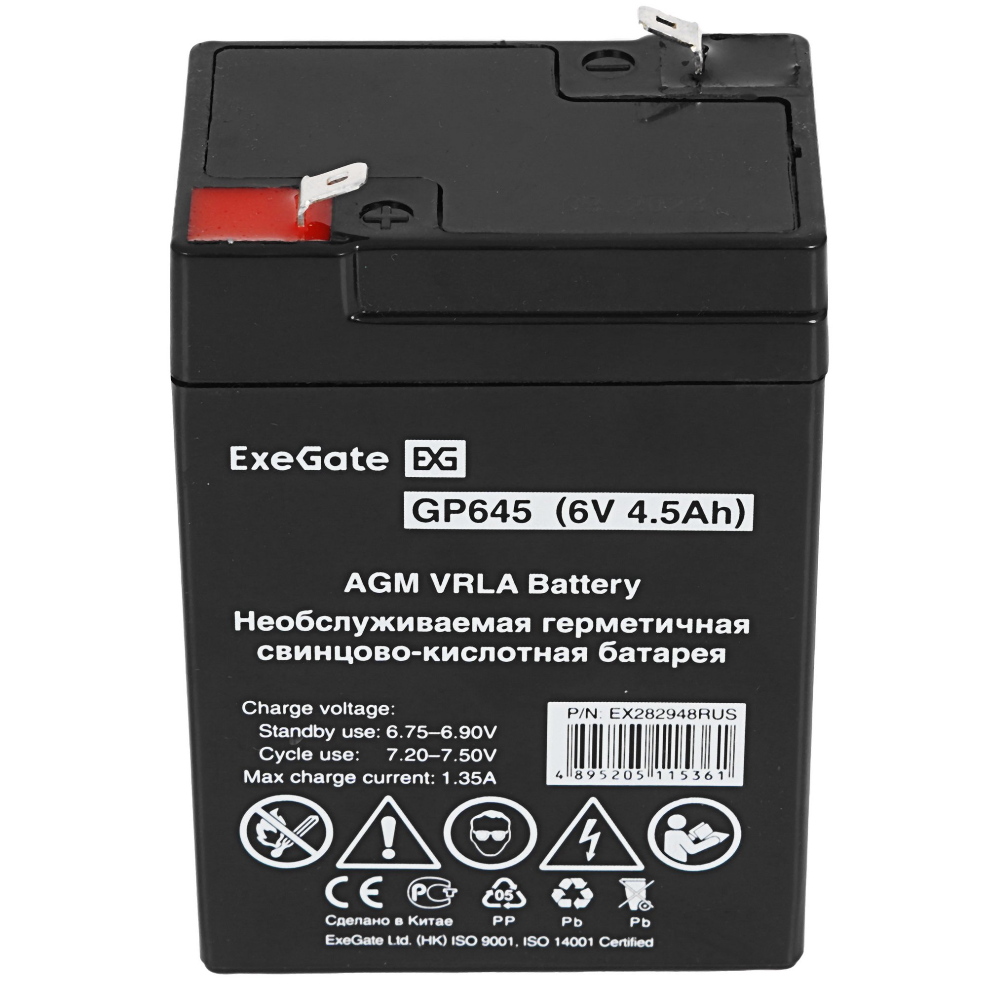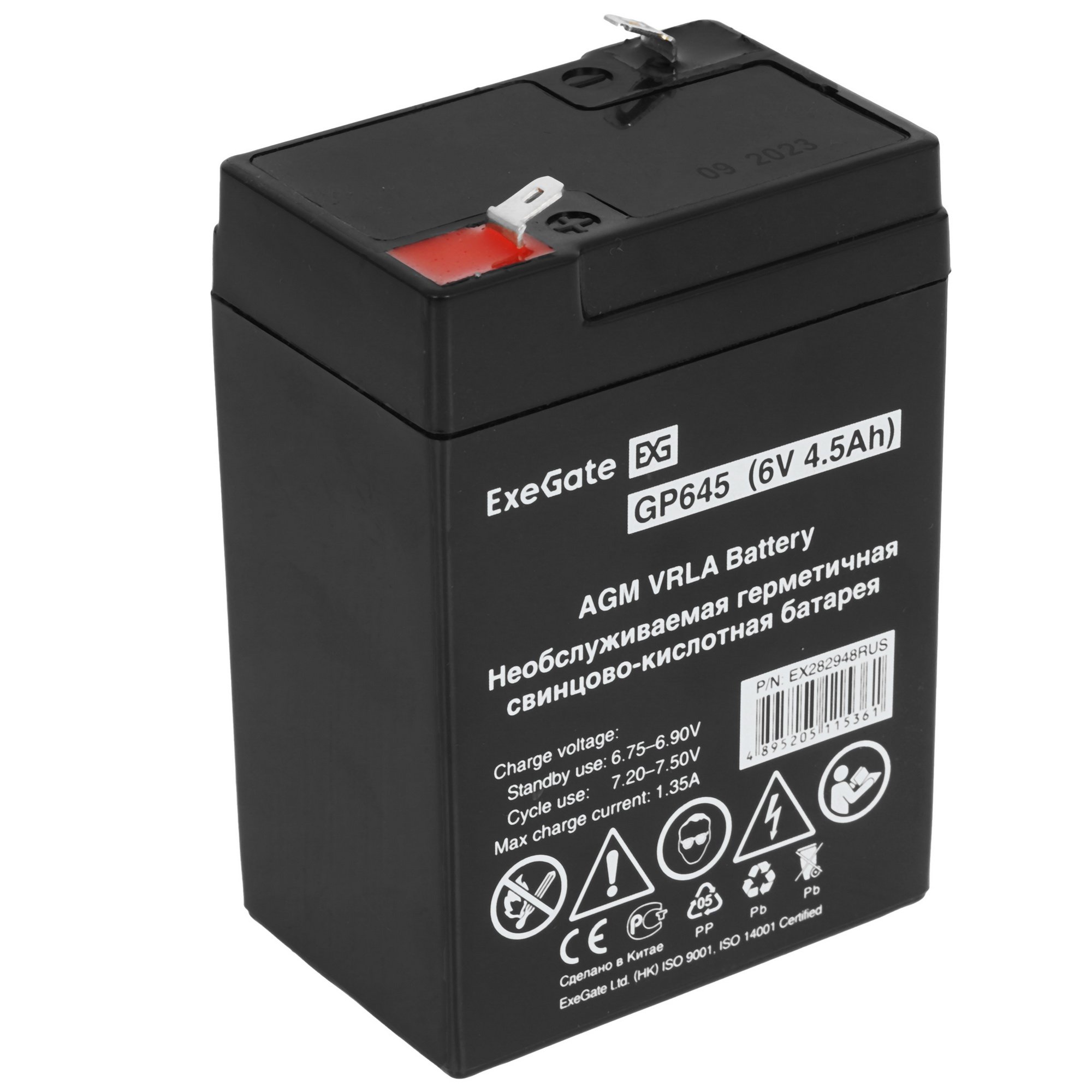 Аккумуляторная батарея ExeGate GP645 подходит для работы в режиме постоянного подзаряда и в режиме разряд-заряд. Она изготовлена по технологии AGM. Кислотный электролит находится внутри герметичного блока и не вытекает даже при повреждении корпуса.