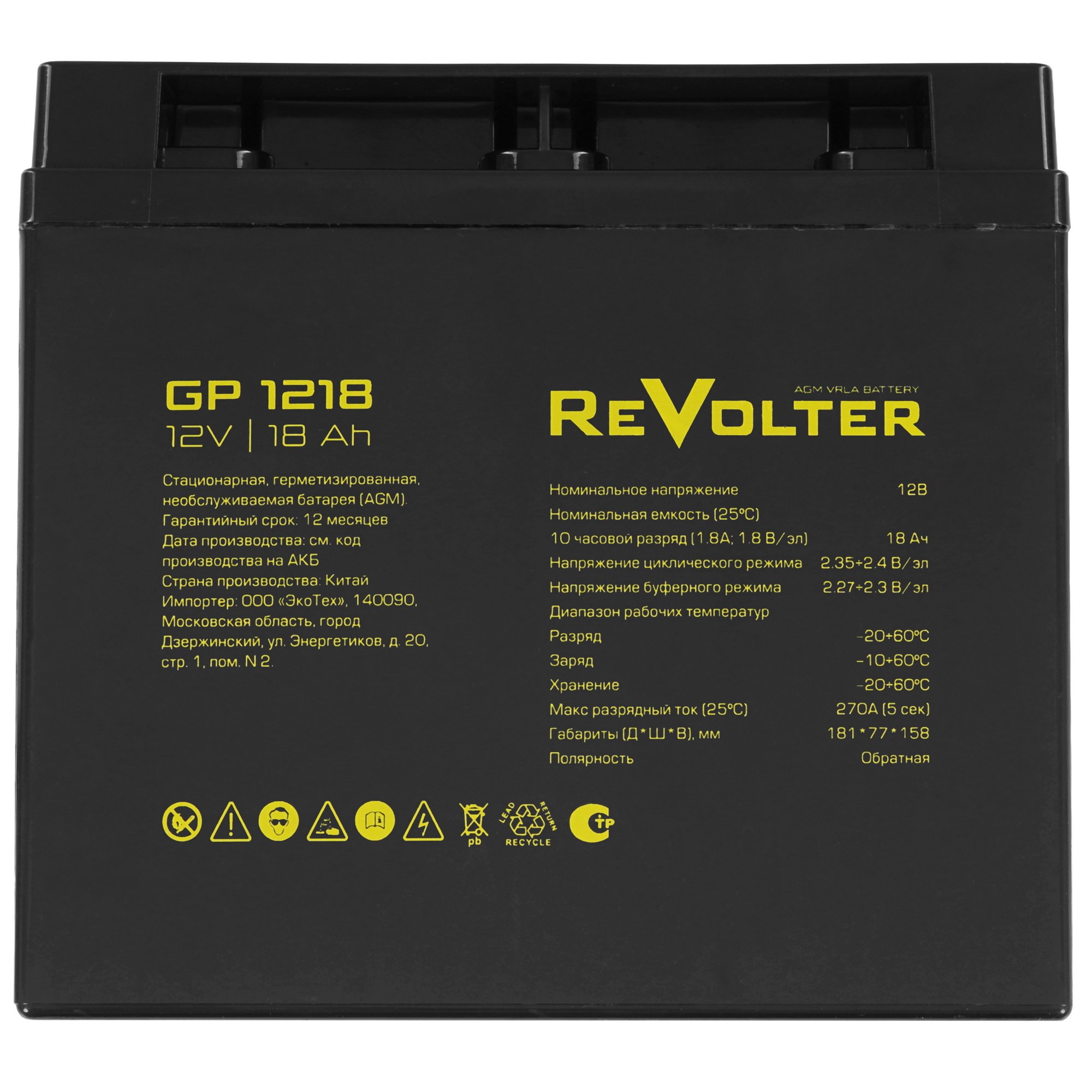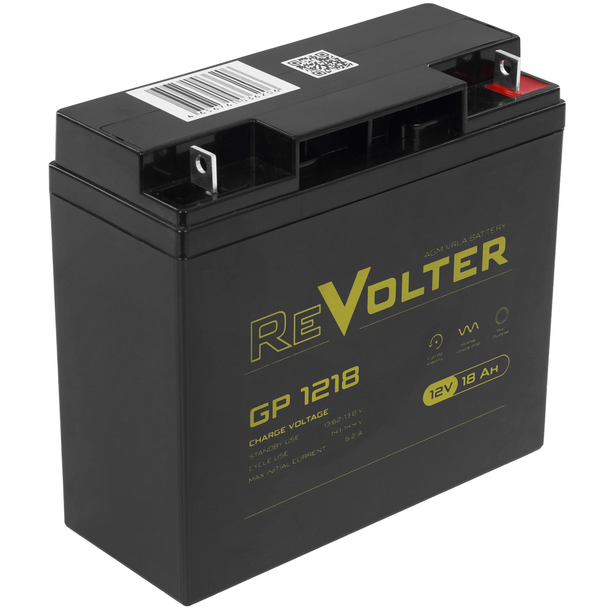 Аккумуляторная батарея для ИБП ReVolter GP 1218 подходит для эксплуатации в буферном и циклическом режимах. Она изготовлена по технологии AGM с системой рекомбинации газов VRLA. Кислотный электролит находится внутри герметичного блока и не вытекает даже при повреждении корпуса.