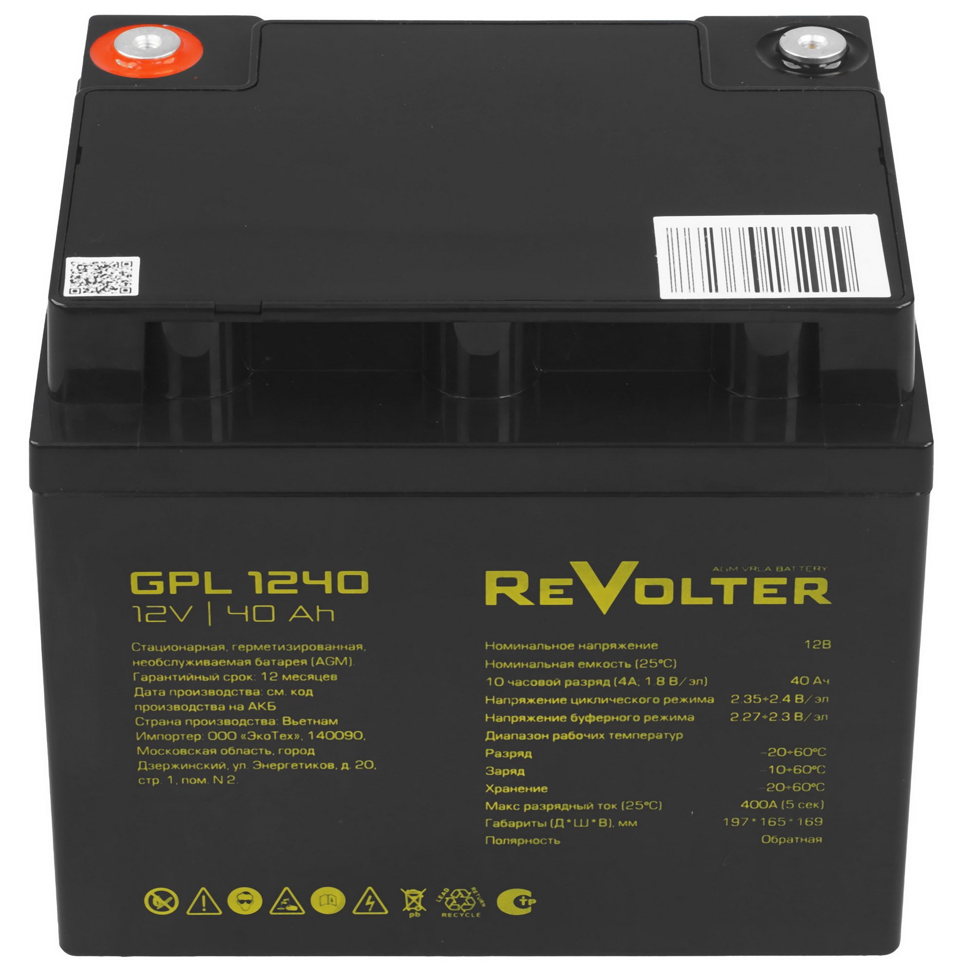 Благодаря повышенным разрядным характеристикам батарея гарантирует бесперебойную работу в экстремальных условиях. Подключение выполняется с помощью клемм T7. Батарея для ИБП ReVolter GPL 1240 рассчитана на срок службы до 10 лет.
