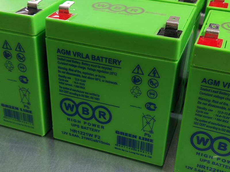 Корпус из ударопрочного пластика ABS устойчив к механическим воздействиям. Подключение к оборудованию выполняется с помощью клемм стандарта T2/F2. Батарея WBR HR1221W F2 рассчитана на срок службы до 8 лет в буферном режиме или более 260 циклов заряда-разряда в циклическом режиме.