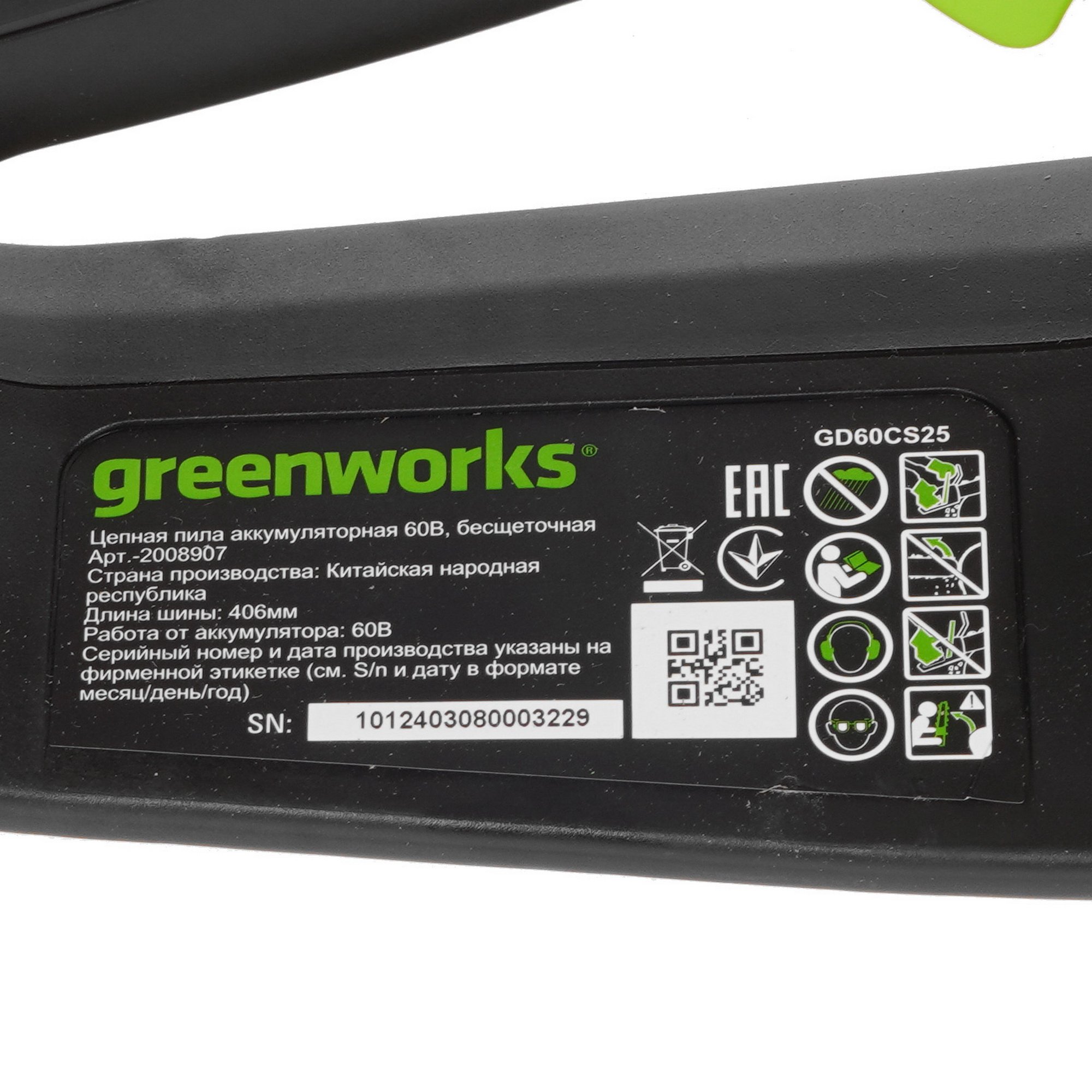 Цепная пила аккумуляторная GreenWorks GD60CS25, 60V, 40 см, бесщеточная, 2500 Вт, без АКБ и ЗУ (2008907)