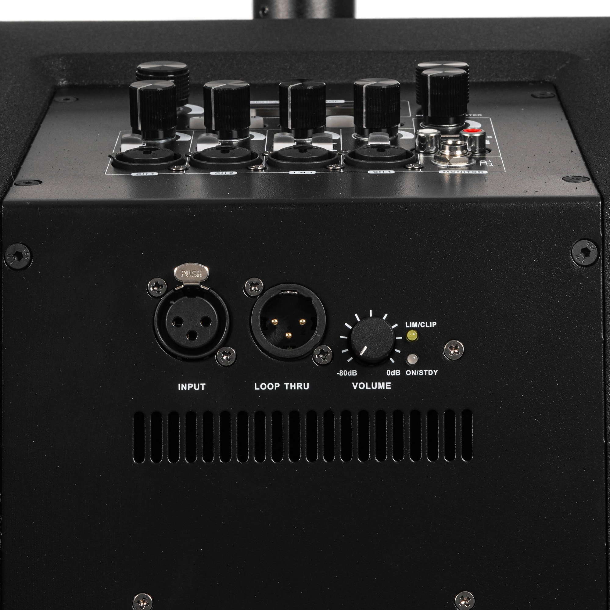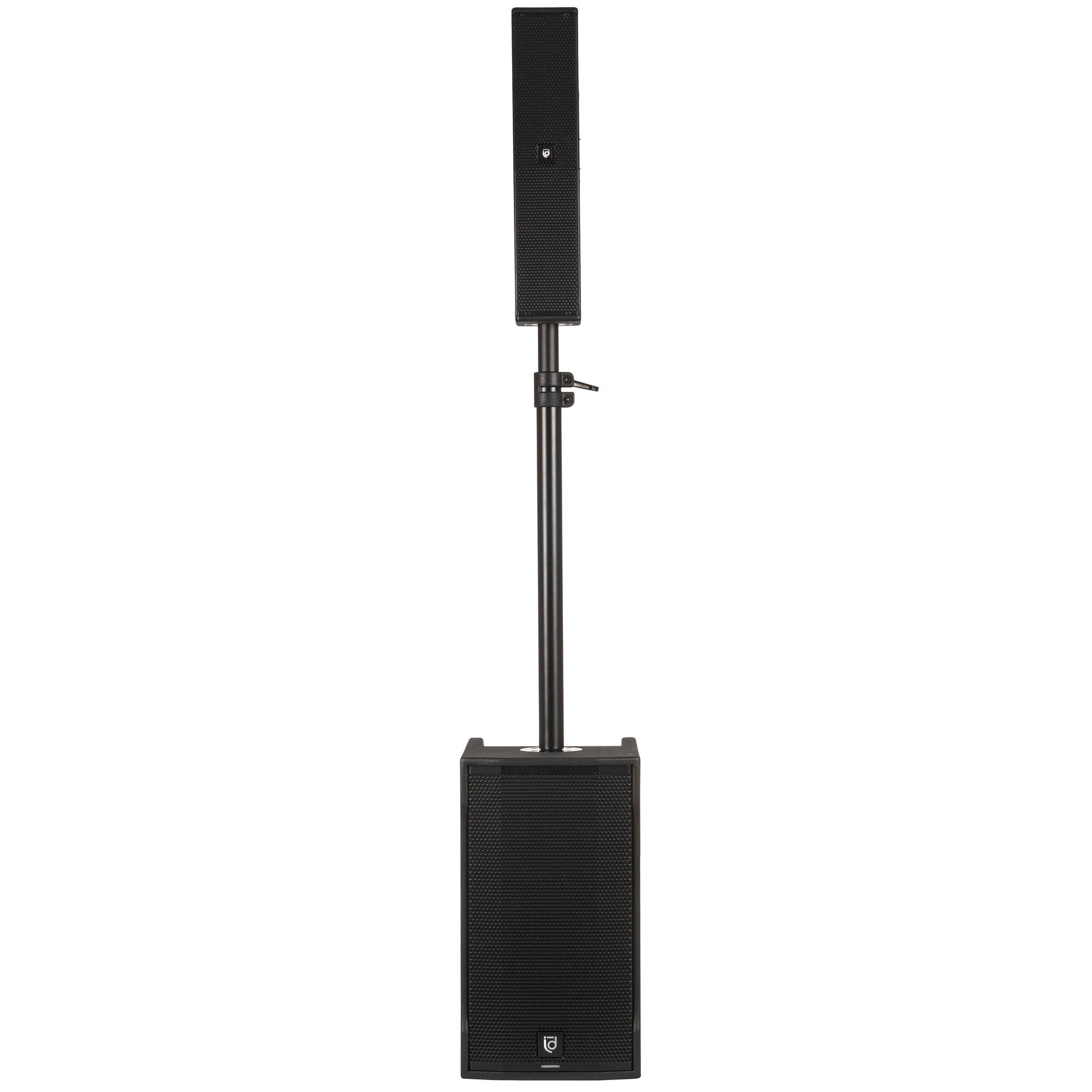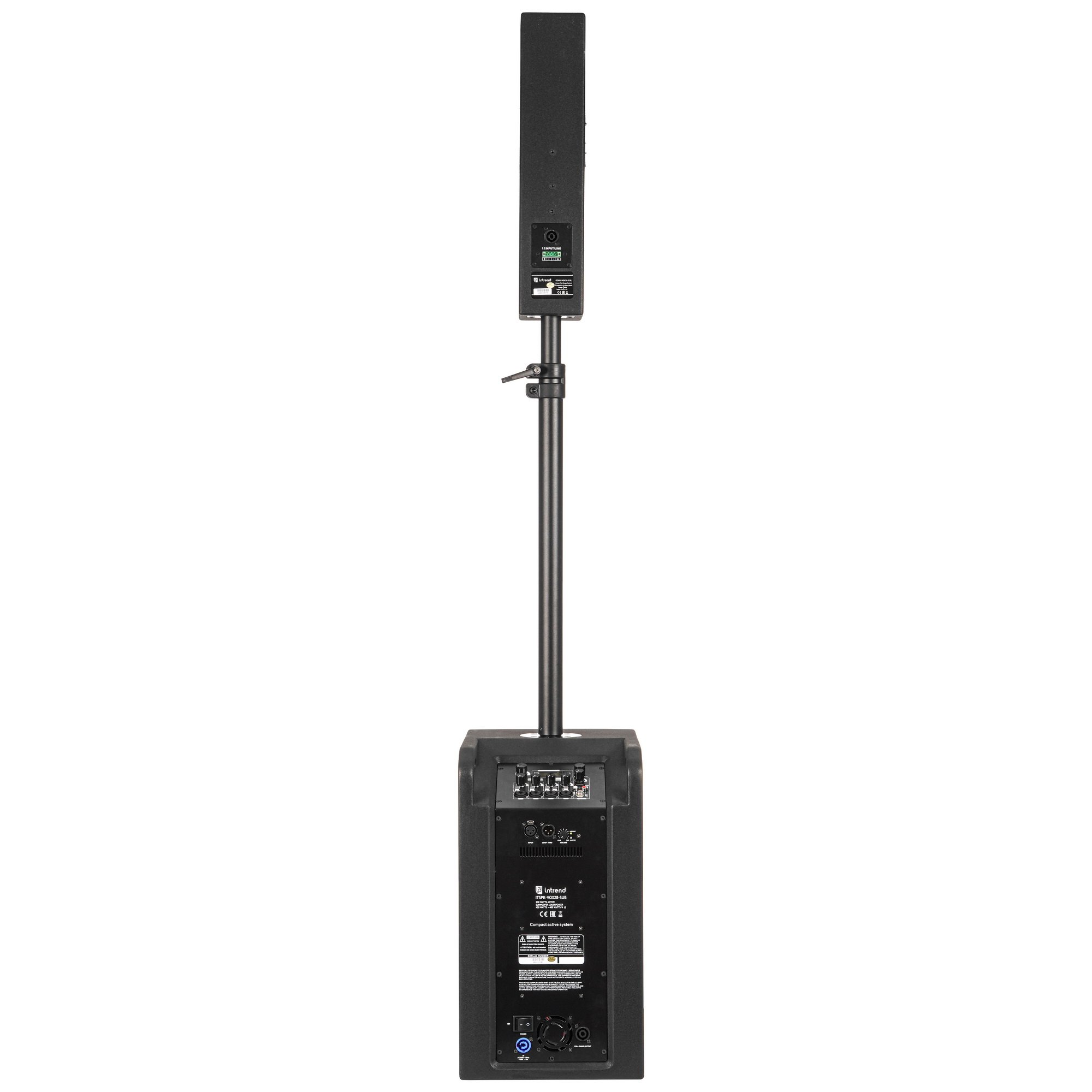 Комплект акустических систем INTREND ITSPK-VOX28 сабвуфер (2х8", 400Вт, 115dB, 40-250Гц) и звуковая колонна (4x3", 160Вт, 121dB, 190Гц-20кГц), 4-канальный микшер, MP3 плеер (USB+SD card), Bluetooth, стойка с коммутацией в комплекте (3 места)