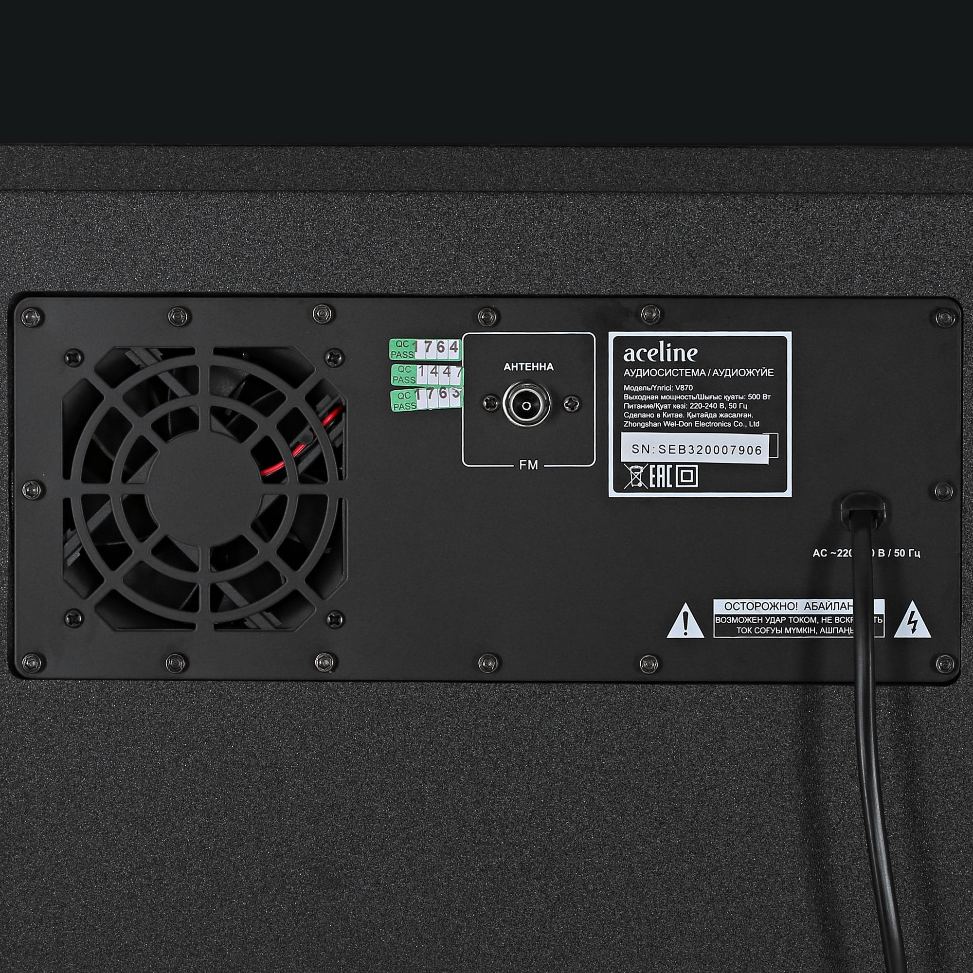 Эквалайзер и регулятор частотного диапазона предусматривают настройку параметров звучания по предпочтениям. Для проигрывания радиостанций встроен FM-тюнер. Домашняя аудиосистема Aceline V870 получает питание от электрической сети.