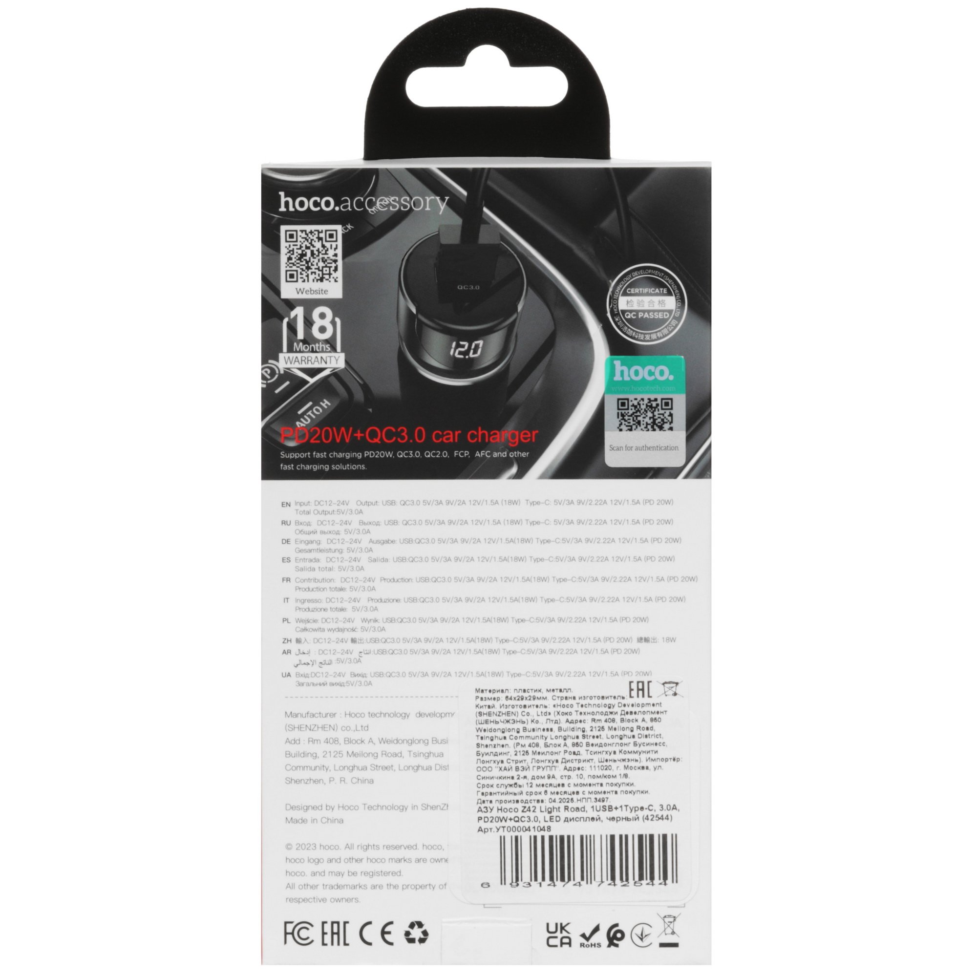 Автомобильная зарядка (от прикуривателя) HOCO Z42, PD20, QC3.0, один порт USB, один порт Type-C, черный