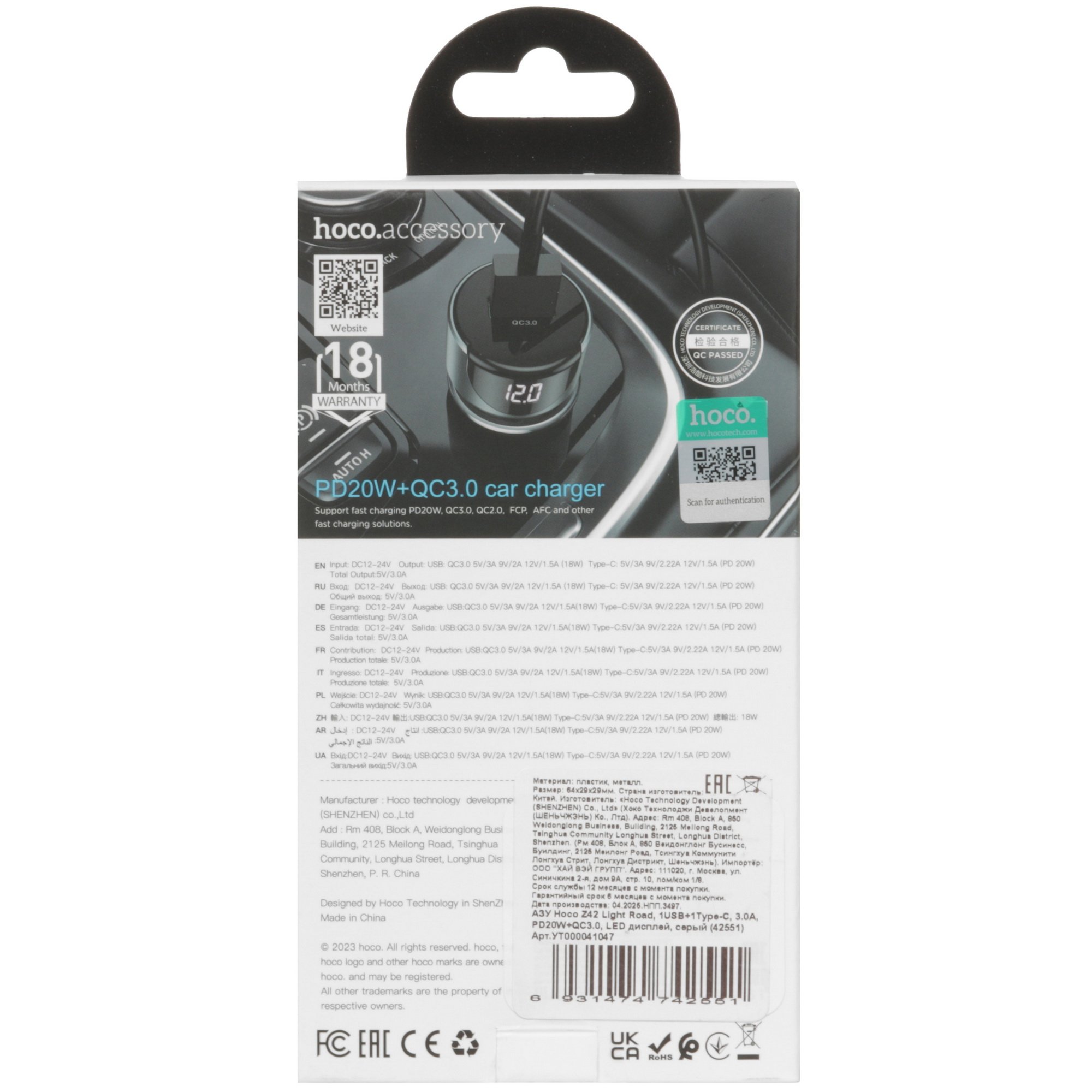 Автомобильное ЗУ Hoco Z42 Light Road в сером корпусе оснащено портами USB-A и USB-C. Модель предназначена для зарядки аккумуляторов смартфонов, планшетов, сотовых телефонов и других портативных устройств. ЗУ обеспечивает ток на выходе до 3 А. Максимальная выходная мощность составляет 20 Вт.