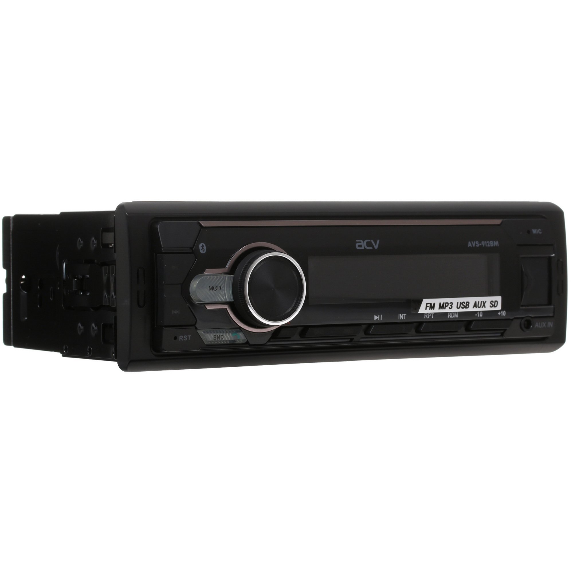 Автопроигрыватель ACV AVS-912BM выполнен в прочном корпусе формата 1 DIN. На лицевой стороне прибора расположен LCD-дисплей с белой подсветкой. Управление работой проигрывателя, настройка громкости звука и переключение треков может осуществляться при помощи ряда механических кнопок с подсветкой синего цвета. Поставка устройства осуществляется в фирменной картонной упаковке вместе с набором креплений и кабелей.