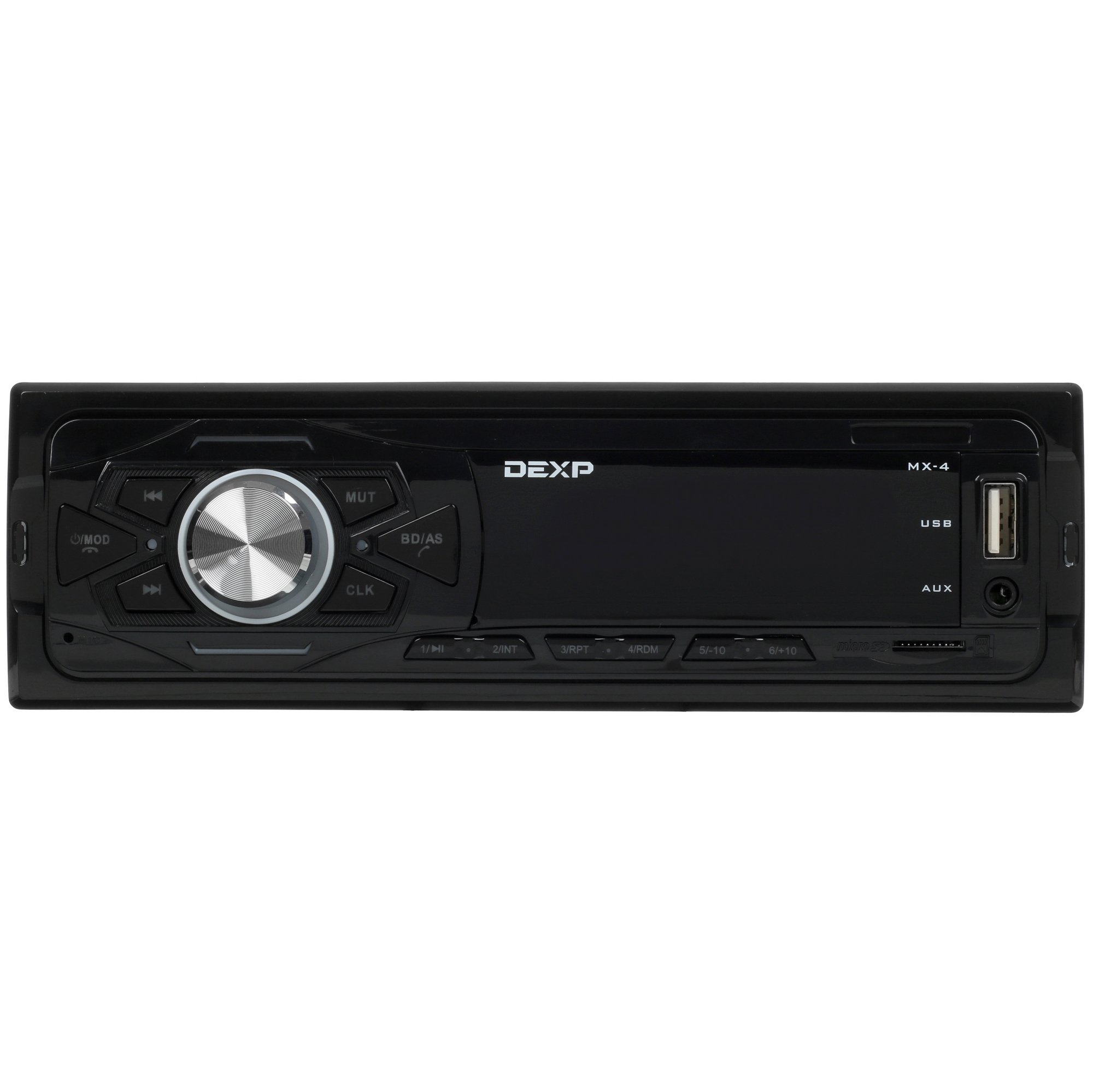 Фронтальная панель DEXP MX-4 содержит информативный сегментный LCD-дисплей с красной подсветкой. Для управления громкостью используется поворотный переключатель, для настройки и выбора композиций, режимов предусмотрены кнопки. Также на лицевой панели находятся разъемы USB, AUX для подключения источников звука, а также слот для SD-карт. Это позволяет воспроизводить готовые плейлисты. Синхронизацию со смартфонами и планшетами обеспечивает технология Bluetooth. Благодаря этому через проигрыватель можно совершать звонки в режиме «hands-free».