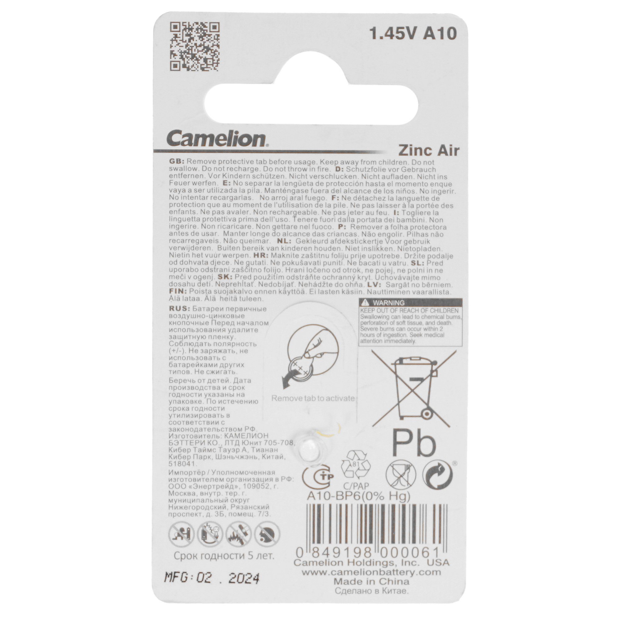 Батарейка Camelion ZA10 с напряжением 1.4 В и емкостью 90 мАч обеспечит питание слуховых аппаратов за счет типоразмера PR70. Воздушно-цинковая батарейка Camelion ZA10 отличается стабильным напряжением и отсутствием в составе токсичных веществ. Комплектация представлена 6 батарейками, которые упакованы в блистер. В составе источников питания отсутствует ртуть.