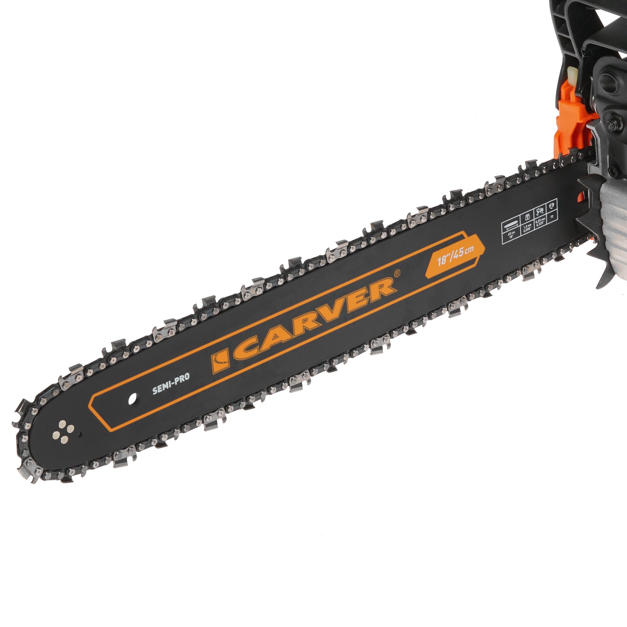 Carver RSG 352 отличается высоким уровнем безопасности благодаря двойному торможению и блокировке от случайного включения. Широкая рукоятка из прорезиненного материала и антивибрационная система позволяют комфортно удерживать инструмент при выполнении работ. Среди других особенностей отмечаются регулируемая система смазки и инструментальное натяжение цепи.