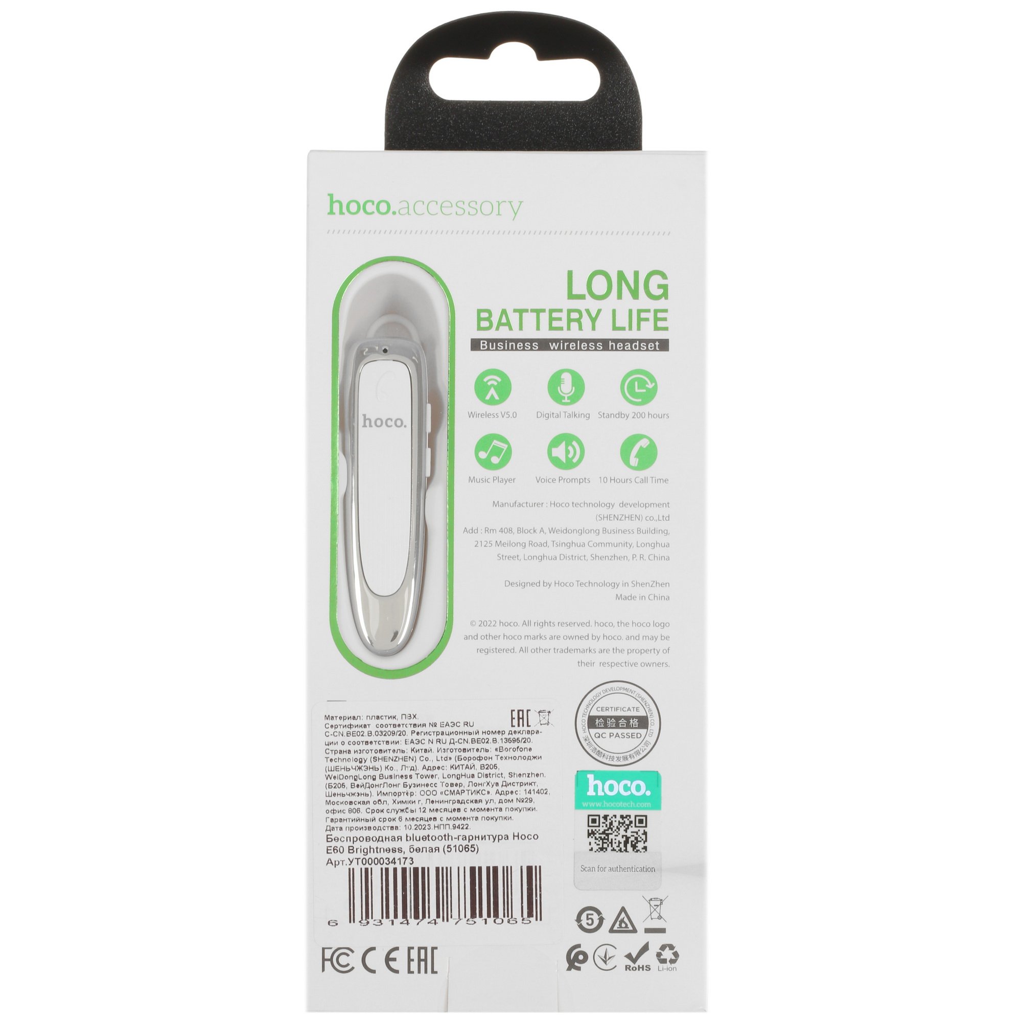 Bluetooth-моногарнитура HOCO E60 оборудована аккумулятором емкостью 150 мАч, энергии которого достаточно для 10 ч автономной работы. Конфигурацией предусмотрен регулятор громкости, а также клавиши для управления композициями и звонками.