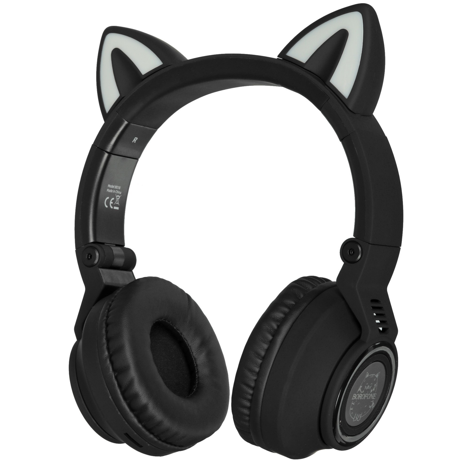 Borofone BO18 Cat - Bluetooth-гарнитура с накладными амбушюрами, подсветкой, забавными кошачьими ушками и временем работы до 7 часов. Есть возможность проводного подключения.