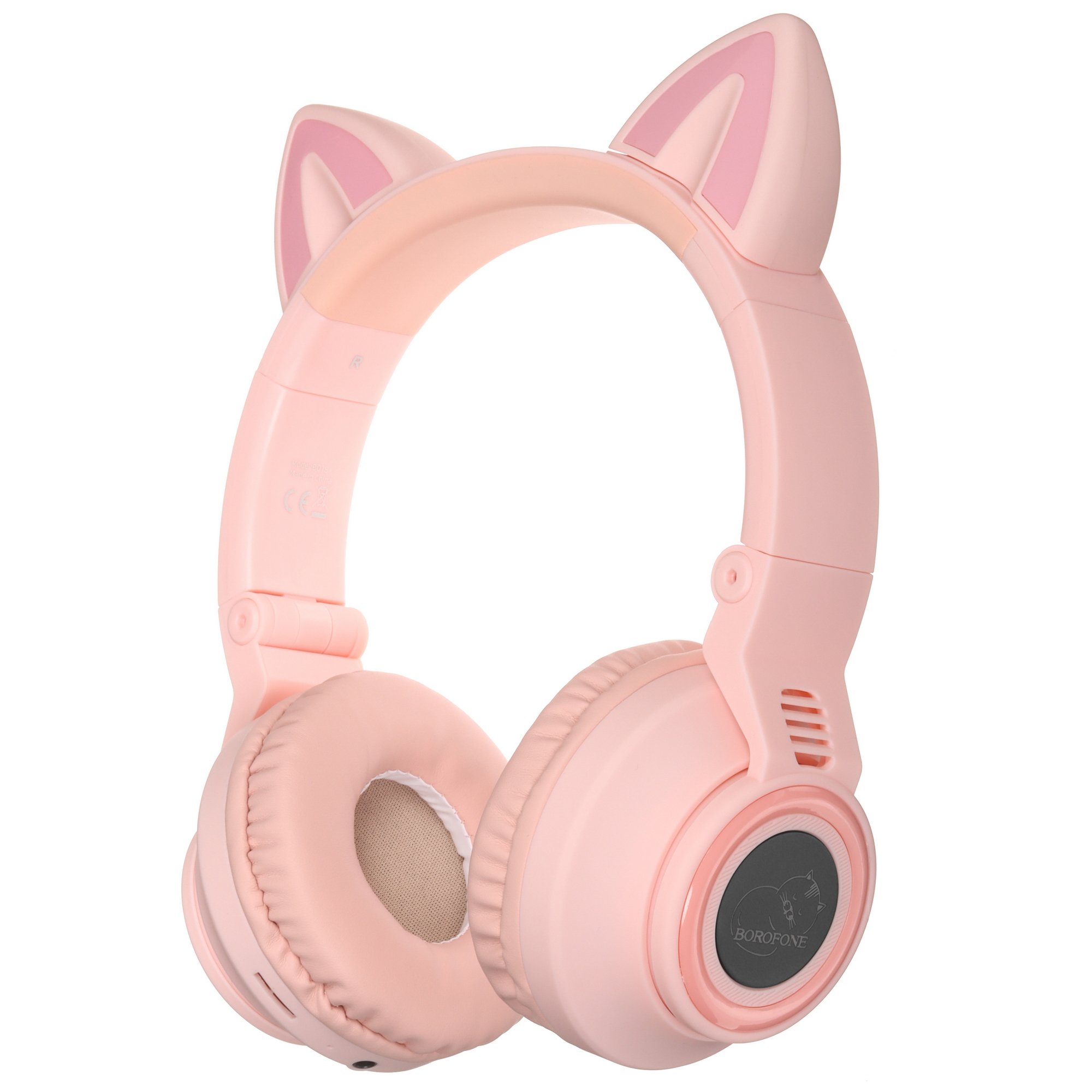 Borofone BO18 Cat - Bluetooth-гарнитура с накладными амбушюрами, подсветкой, забавными кошачьими ушками и временем работы до 7 часов. Есть возможность проводного подключения.