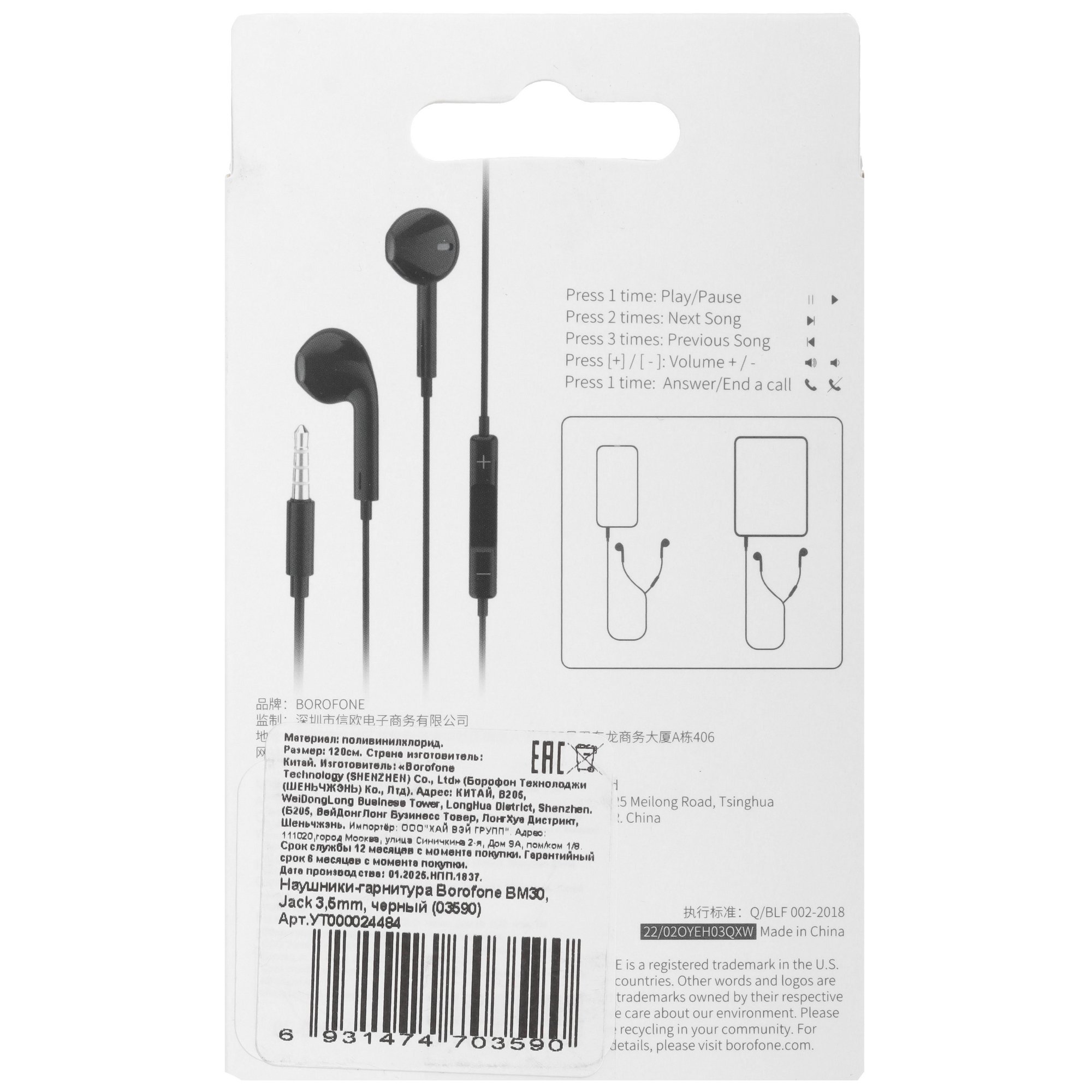 Проводная гарнитура BOROFONE BM30 в черном цветовом исполнении выпускается специально для комфортного прослушивания музыкальных треков или разговоров в мессенджерах, по мобильной сети. Модель с наушниками-вкладышами оснащается динамиками с возможностью передачи звуков в диапазоне частот 20-15000 Гц. Она имеет проводное подключение и работает через 1.2-метровый кабель с прямым штекером jack 3.5 мм, который позволяет подключаться к смартфону, планшету, компьютеру. На акустическом кабеле стереогарнитуры BOROFONE BM30 расположен пульт с тремя клавишами для управления приемом и завершением вызова, воспроизведением музыки. Также внутри фиксированного пульта расположен чувствительный микрофон.